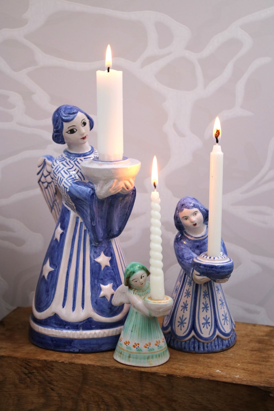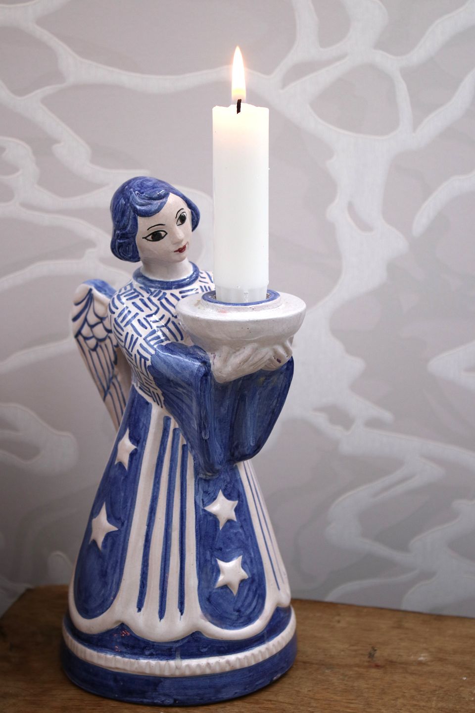 L. Hjorth ceramics rare large angel with blue / white glaze holds a regular size candle. Height: 22cm.