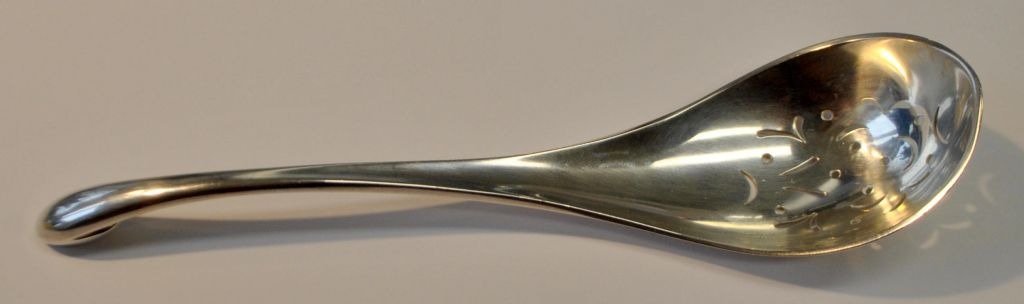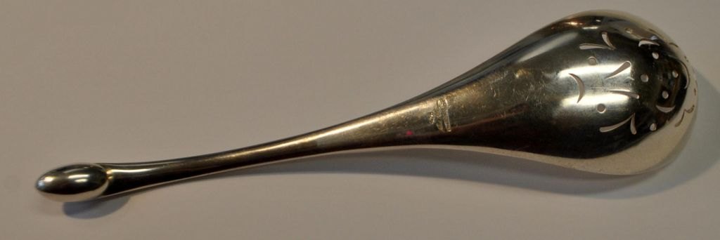 Hans Hansen sterling ice spoon, 20th century. Kolding, Denmark. With hole decorations in the laf. Stamped: Hans Hansen 925 sterling Denmark. L. 17.5 cm. Weight: 64 grams.Perfect condition!