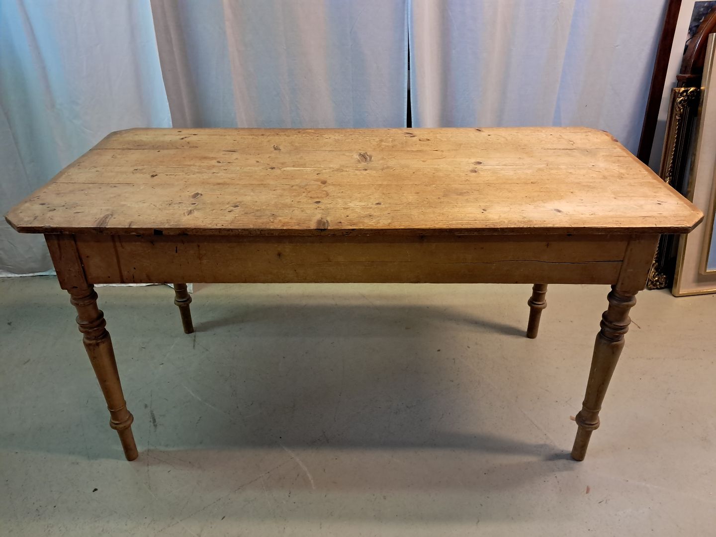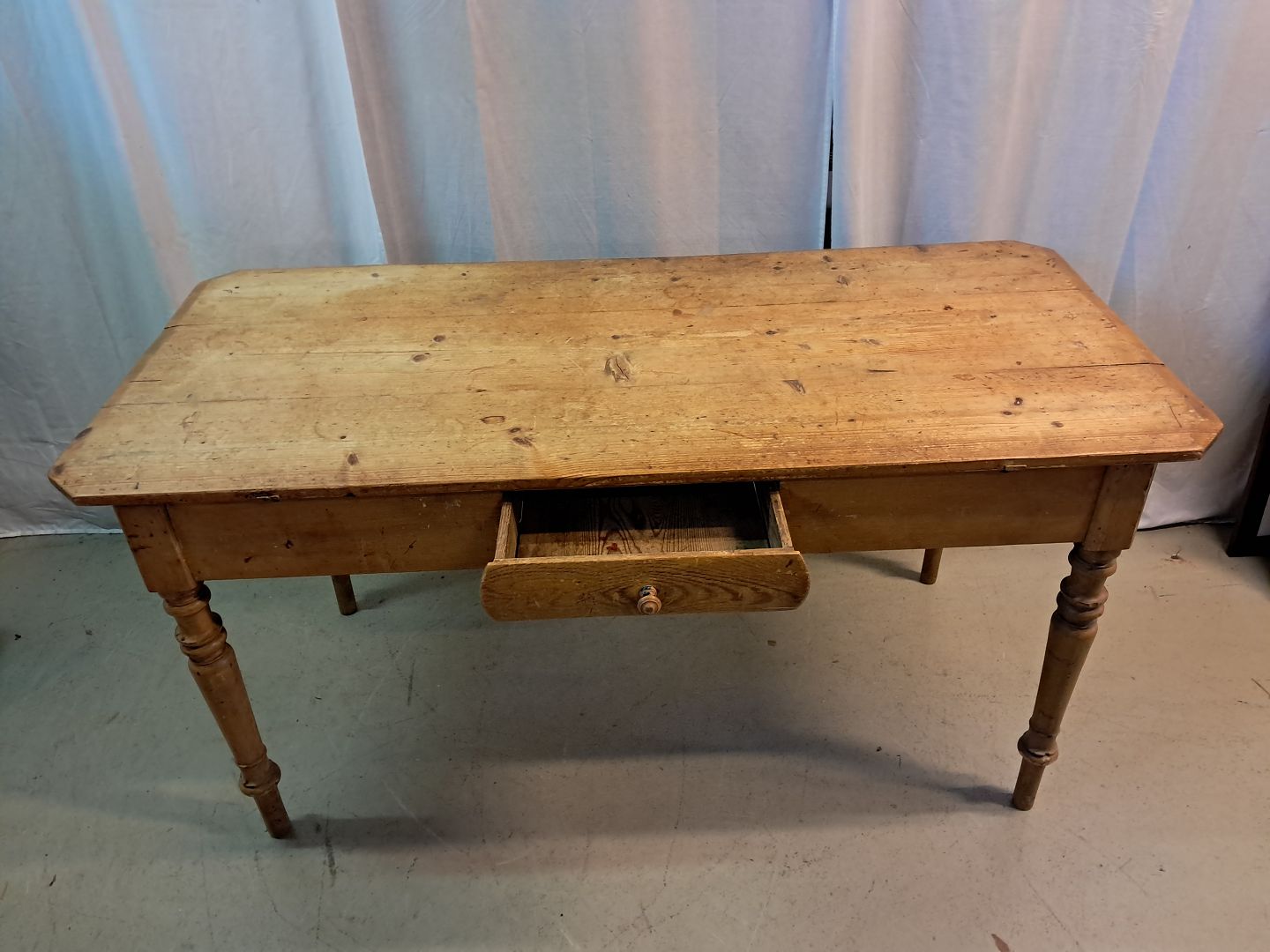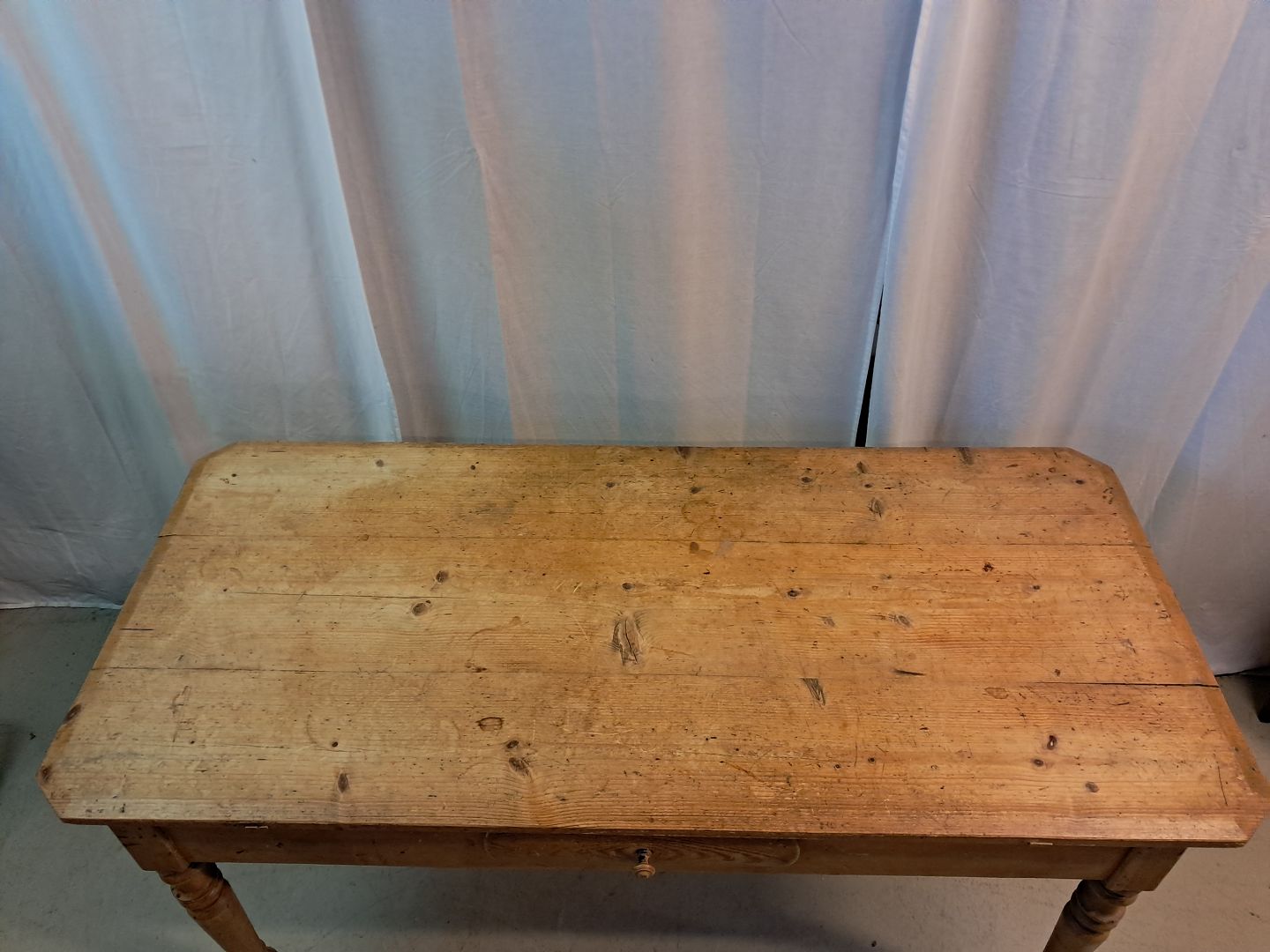 Bord med skuffe i massivt fyrretræ, fra 1910erne.Det har brugsspor.