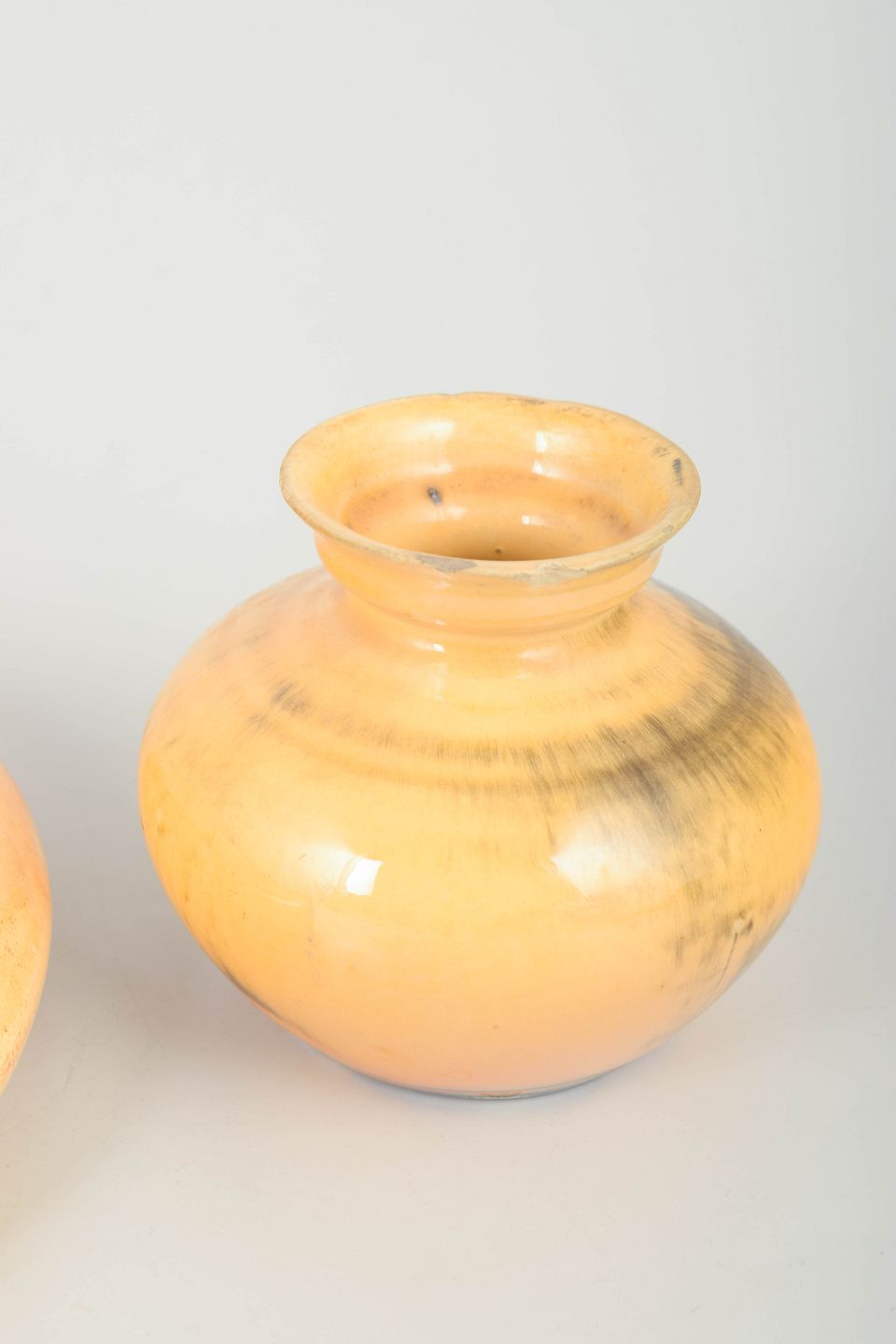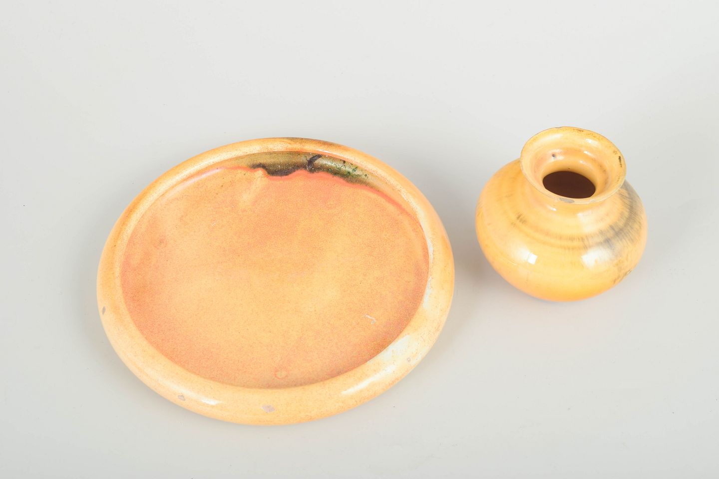 A set consisting of a low circular dish and a small vase, both executed in the characteristic orange-yellow uranium glaze typical of Kähler in the 1930s. The dish features a softly rounded rim with vivid colour transitions, while the vase has a classic form with a narrower neck and rounded body.