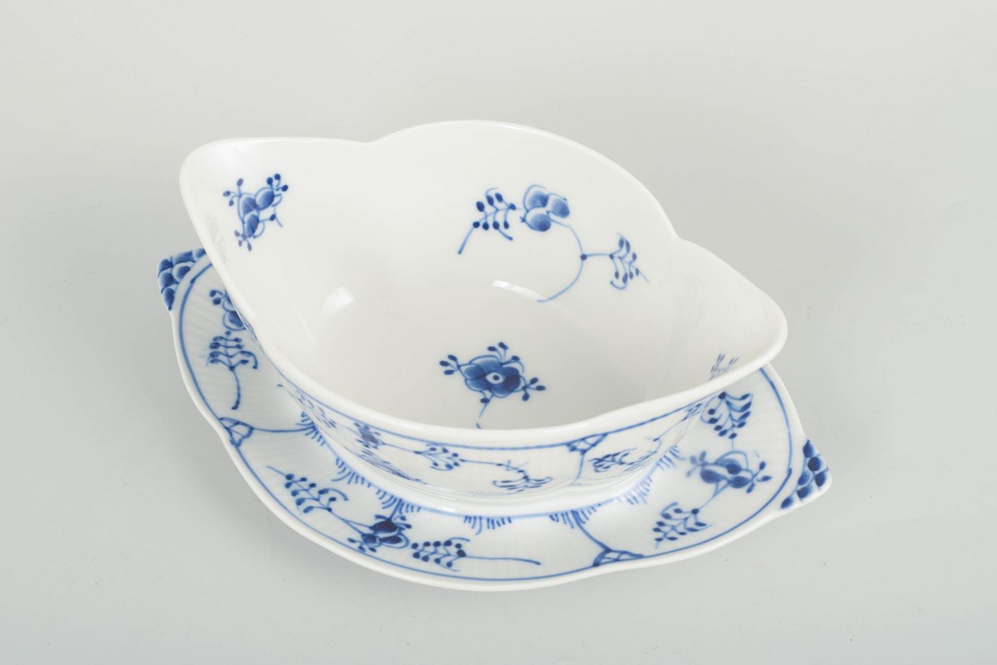Classic sauce boat in the “Blue Fluted Plain” porcelain series with separate underplate. The form is gently curved with a softly faceted rim and hand-painted cobalt-blue decoration on a fluted body. A well-preserved piece from Royal Copenhagen’s late 20th-century production.