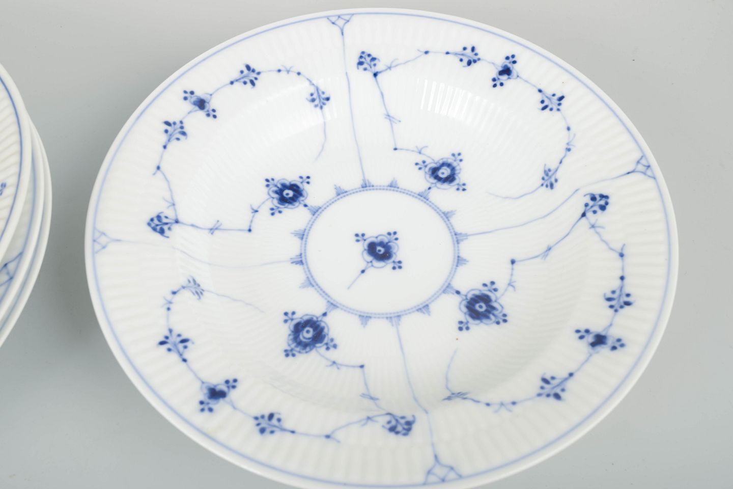 Set of four deep plates in classic Blue Fluted porcelain with hand-painted blue decoration and a fluted body.
