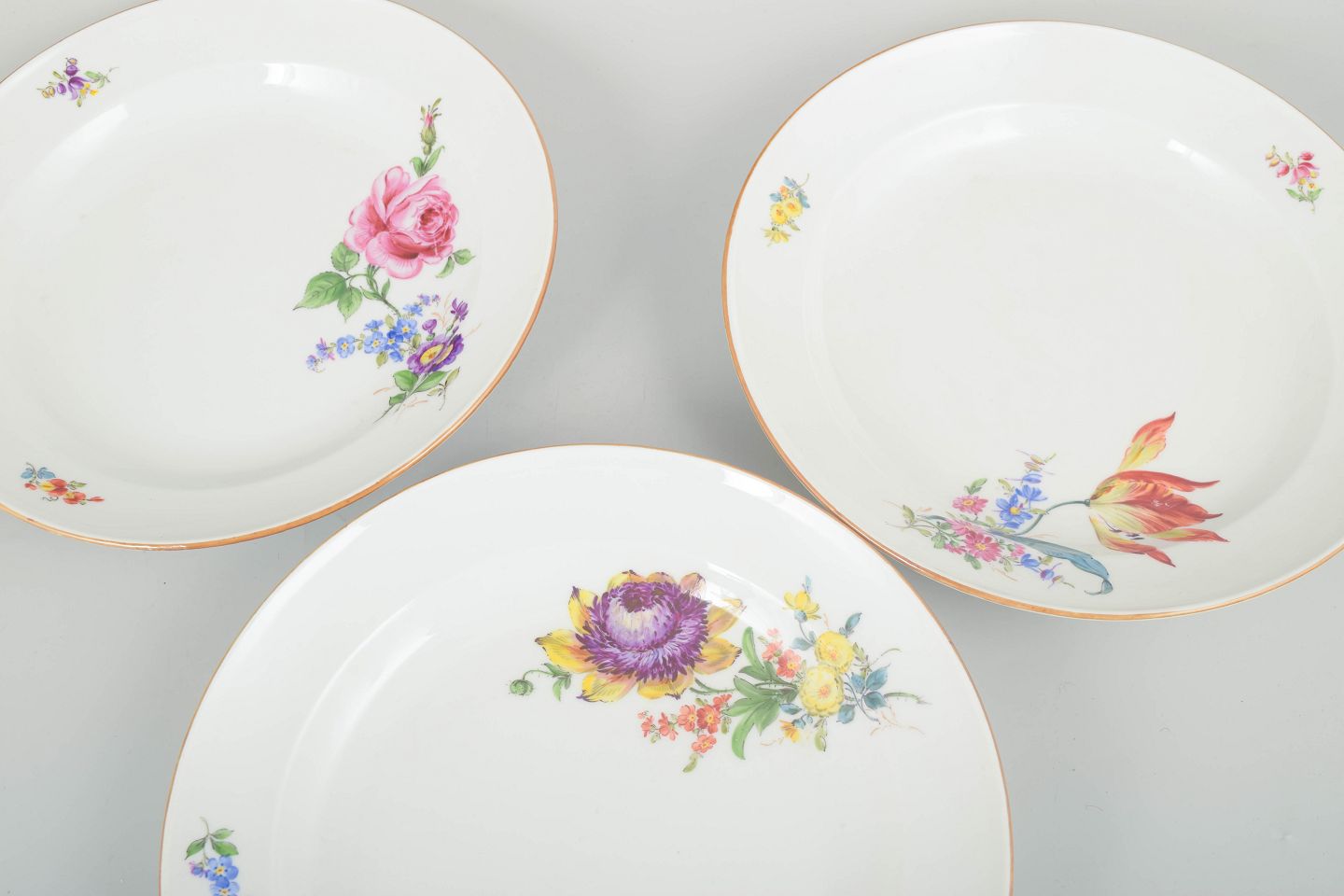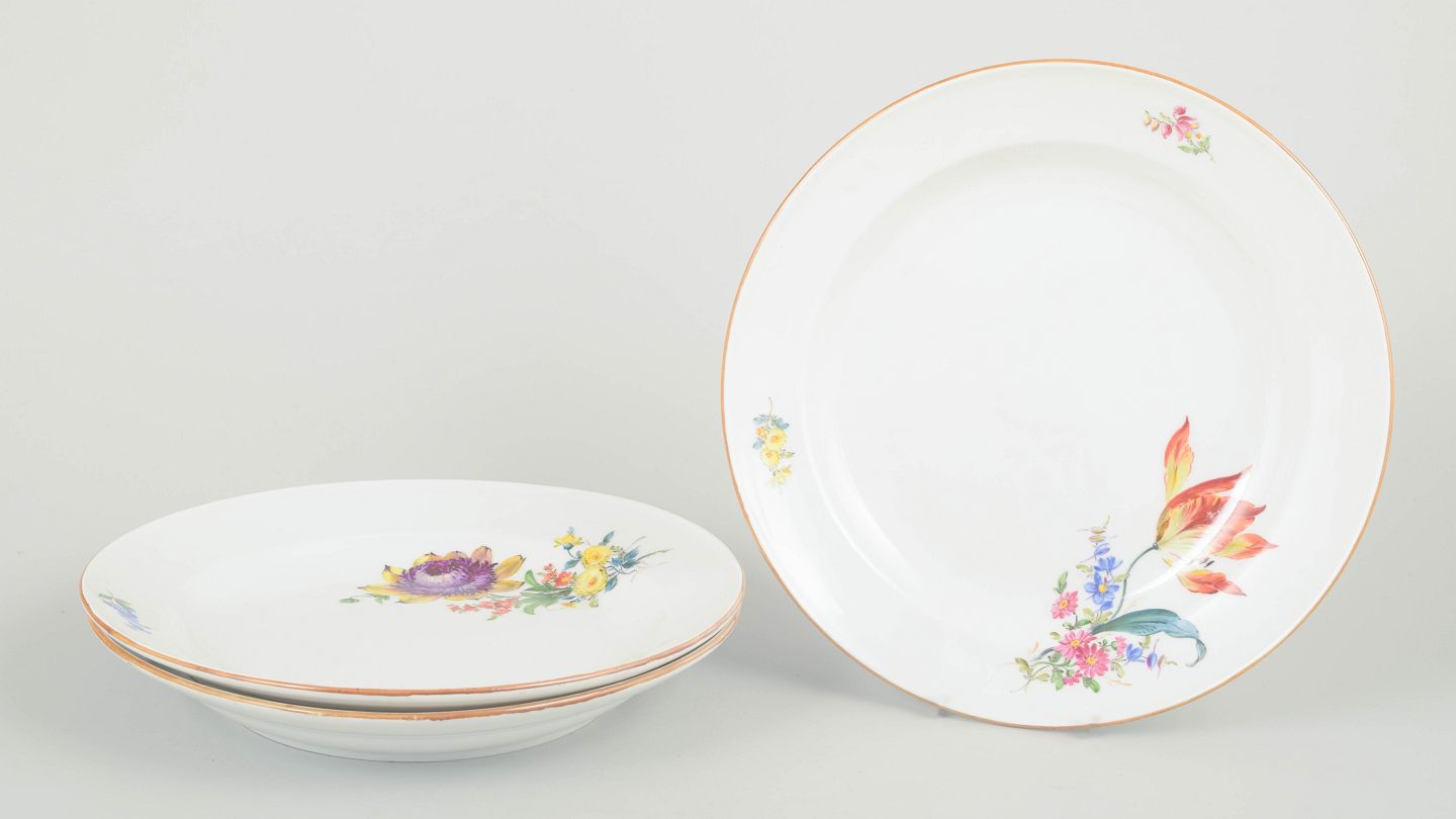 Hand-painted porcelain plates with colourful floral motifs in classic Meissen style. Elegant composition with slightly asymmetrical placement of the decorations.