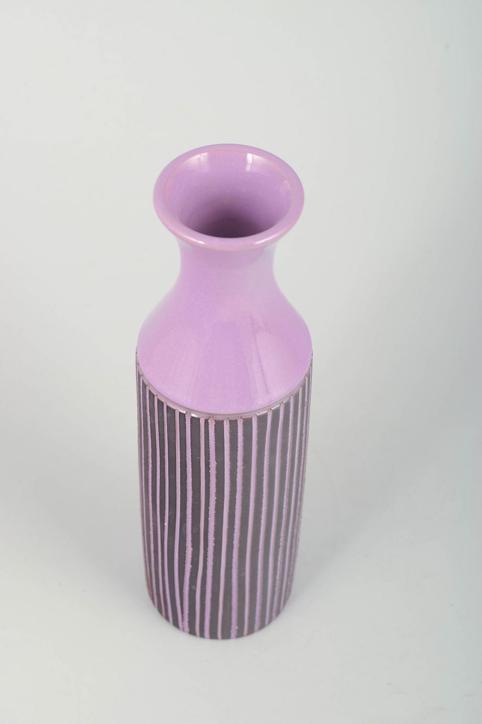 Tall cylindrical retro vase in purple glaze with hand-painted vertical striping in dark and light tones. A classic 1970s aesthetic with graphic decoration and an elegant, slender profile. The base is signed, though the signature is illegible.