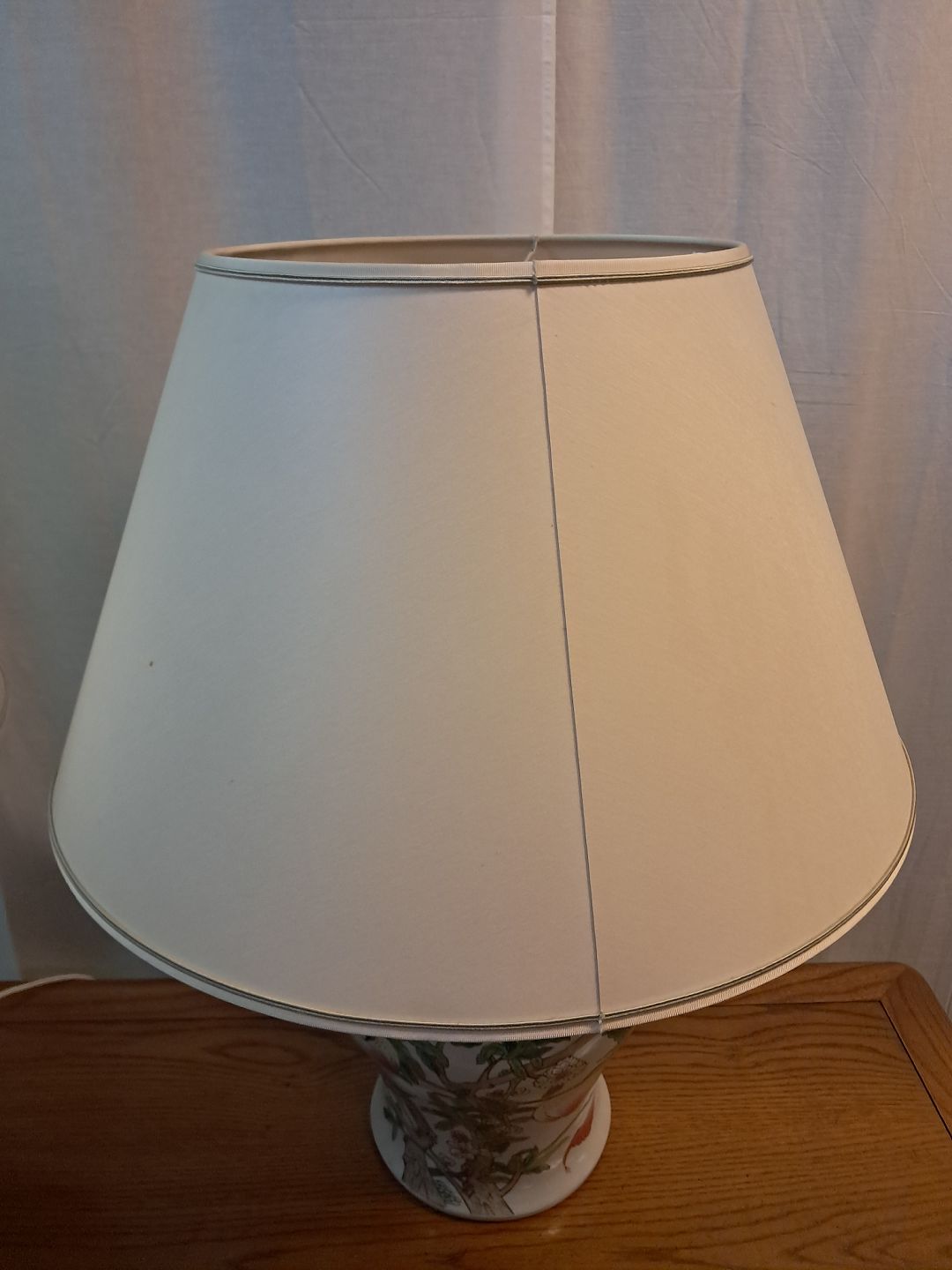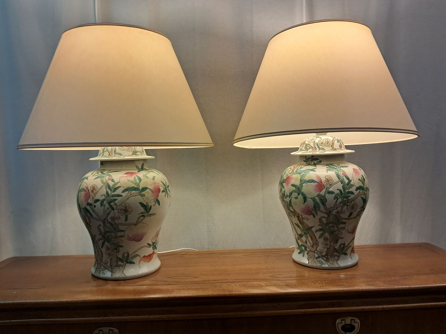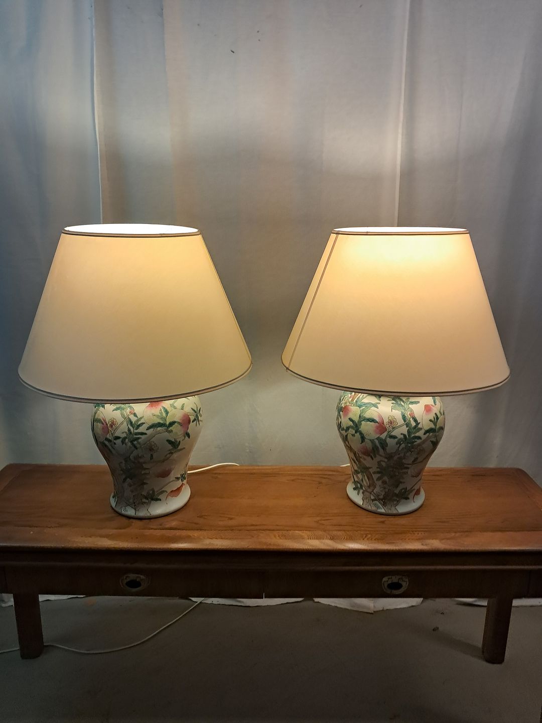 2 Asiatiske bordlamper i pocelæn med skærme, fra 1990erne.De har brugsspor.
