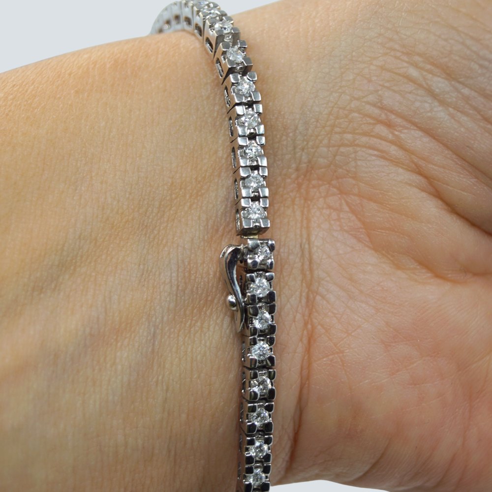 A tennis bracelet in 18k white gold set with diamonds, app. 1,53 ct. Wesselton - SI. Clasp with one safety catch.L. 18 cm. W 3 mm.