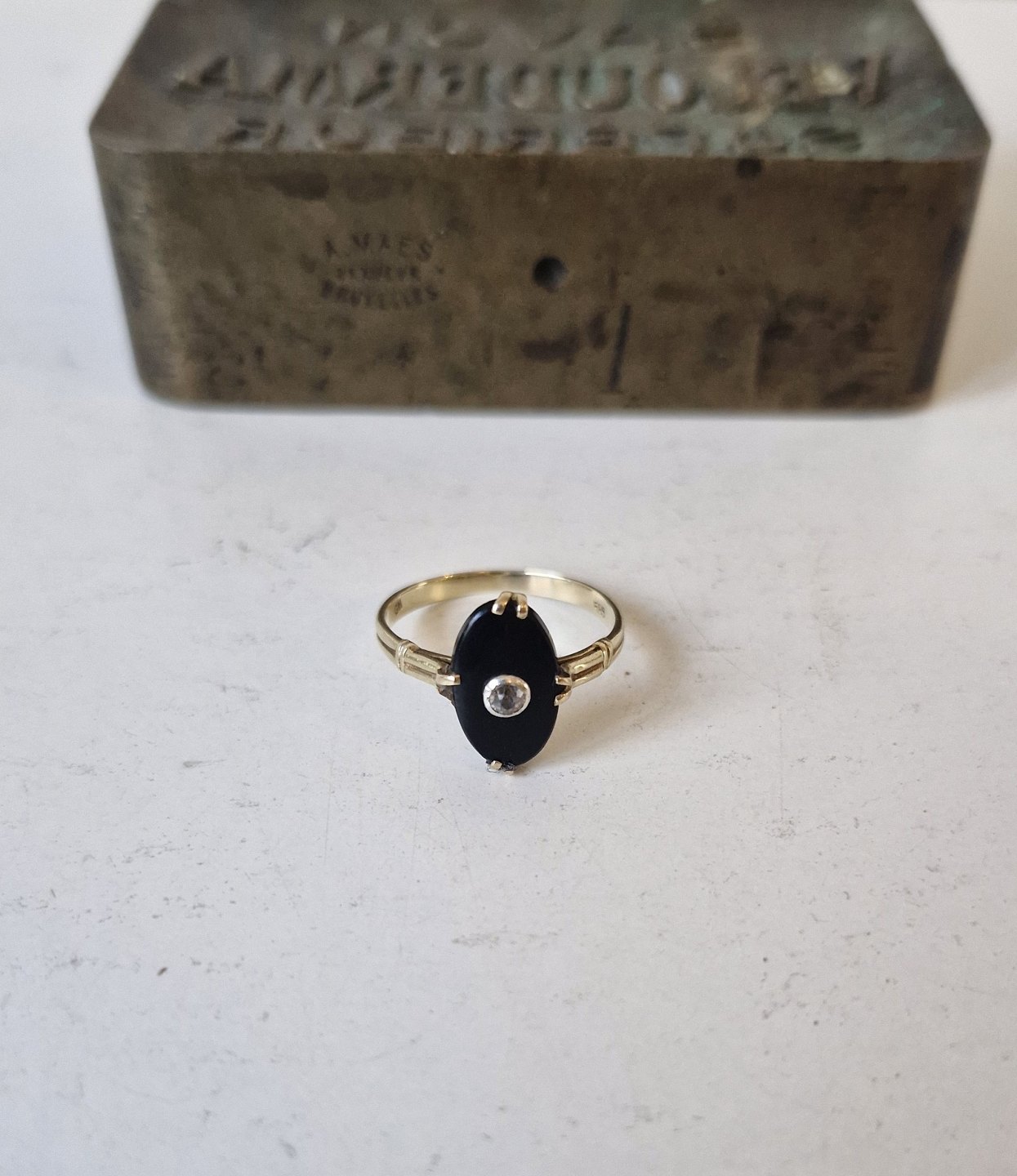 Beautiful old ring in 14 kt. gold with oval onyx adorned with old cut diamond.Stamp: 585 - GH