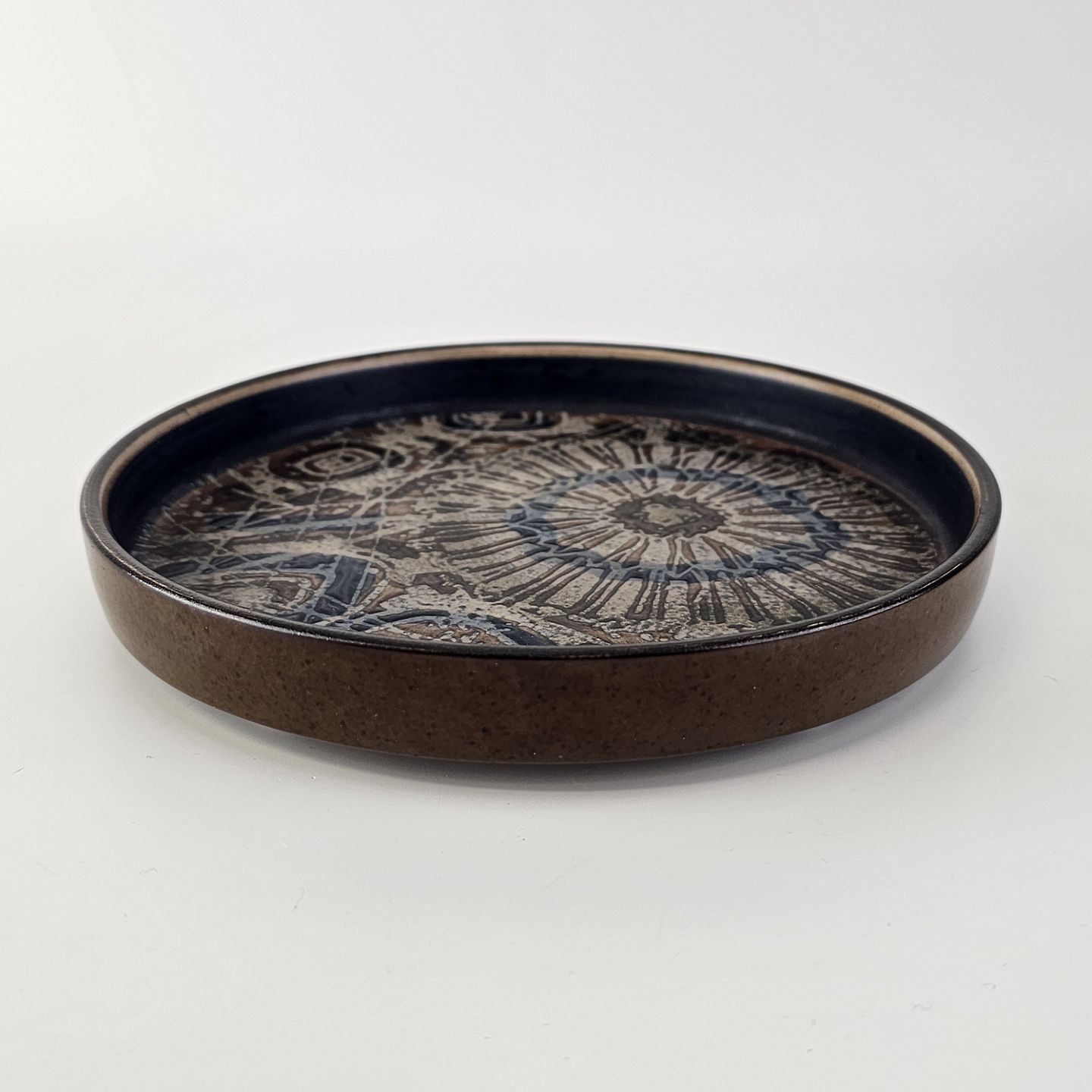 Flad rund skål i fajance fra Baca serien med mønster i brune nuancerNr 870/3290