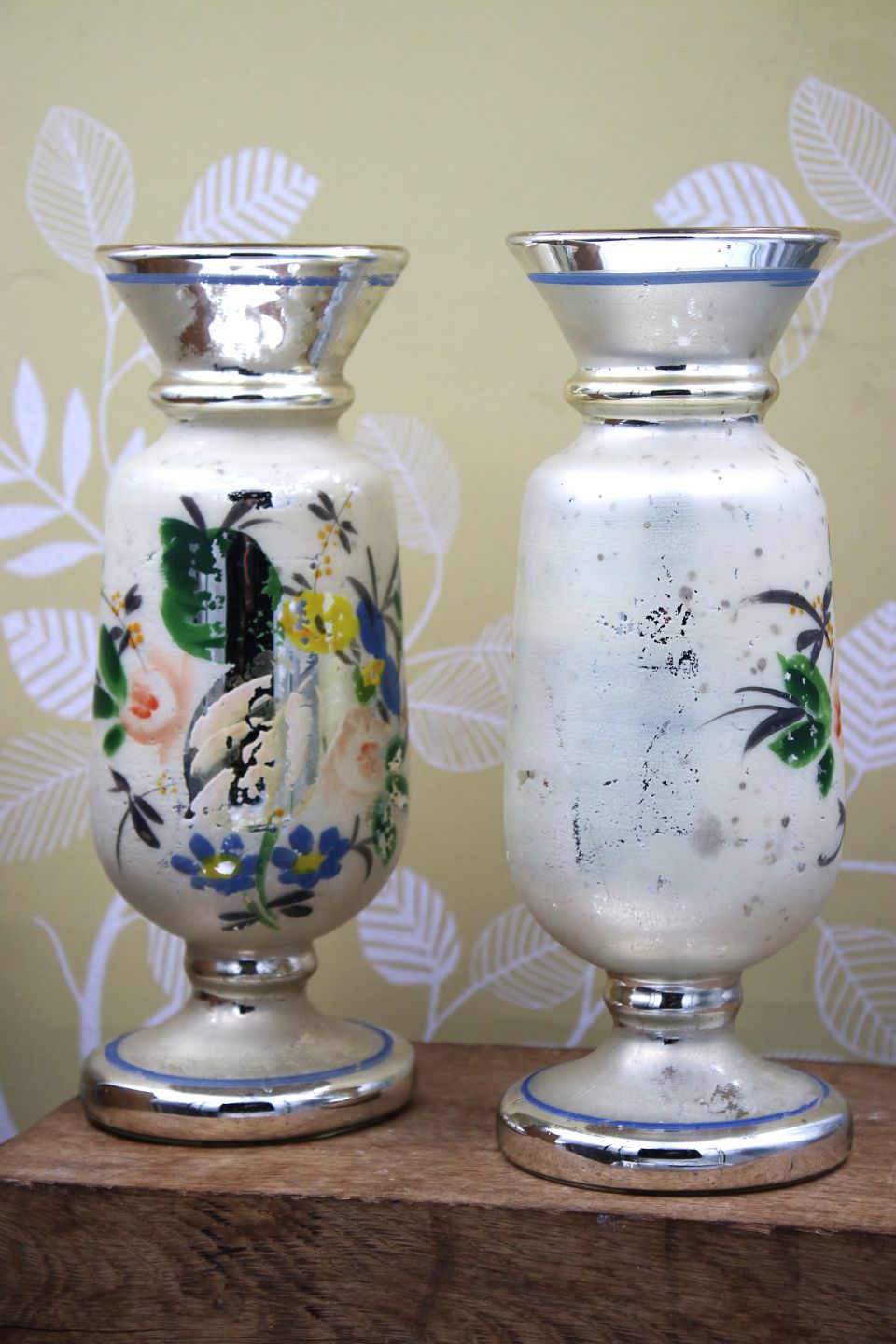 19th century vases in mercury glass (poor man's silver)decorated with hand-painted floral motifs.
