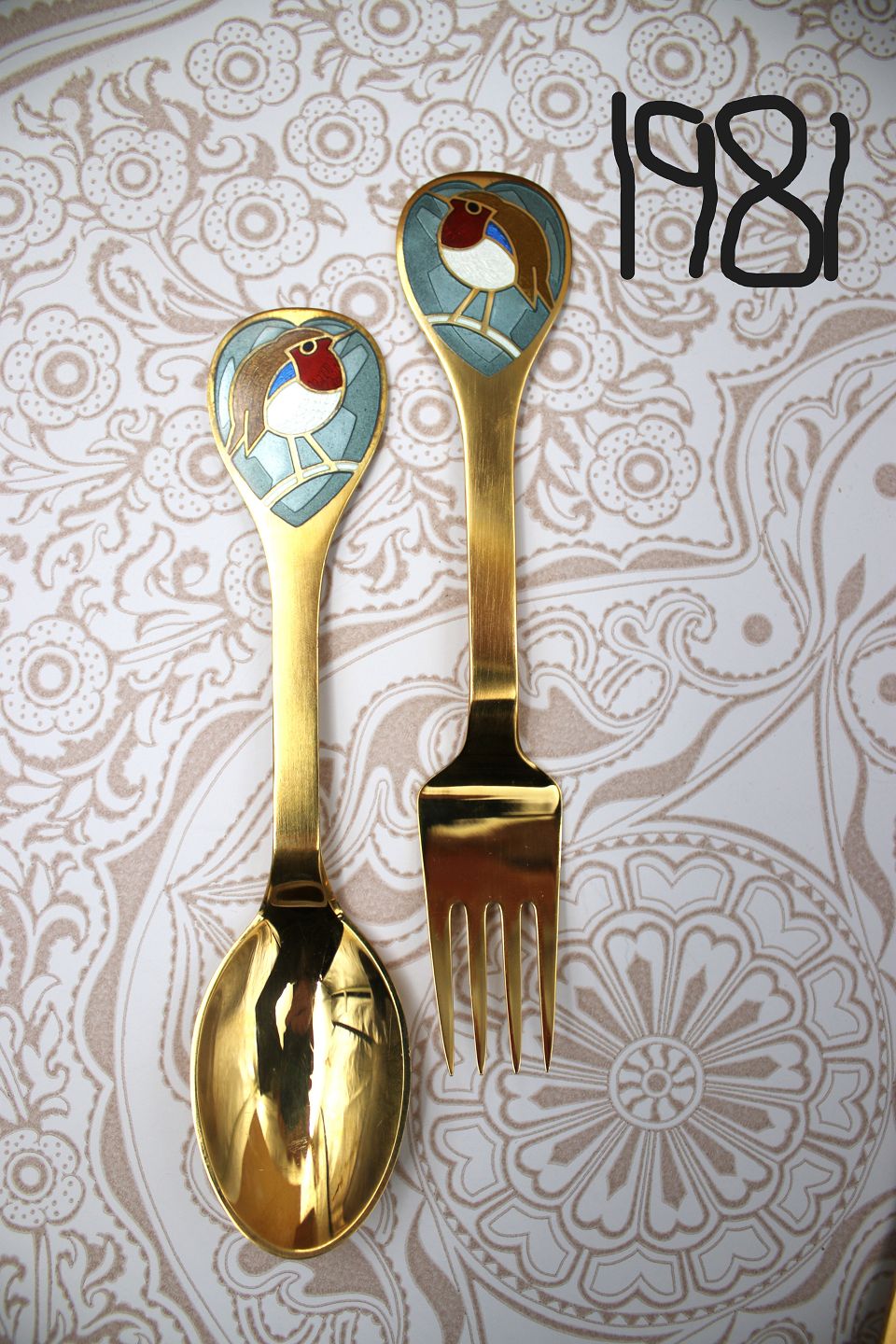 A. Michelsen's Christmas spoons & forks from the 80s. in gilded silver with enamel Christmas motifs.1980: Fork, 1981: Spoon - Fork, 1982: Spoon - Fork,
