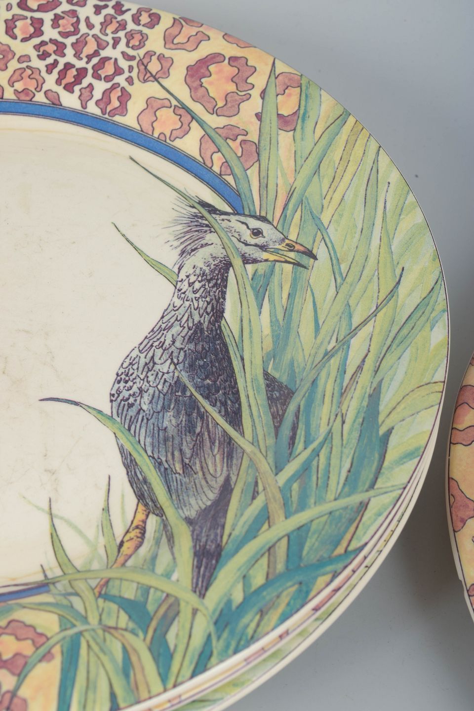 Decorative faience plates by Gien in the colourful, nature-inspired “Savane” pattern with its characteristic border and motif. A complete set of six plates.