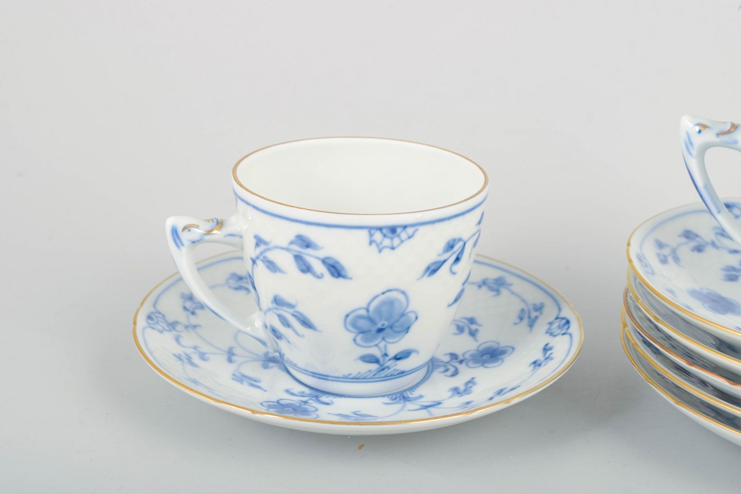 Set of six coffee cups with saucers in the classic hand-painted Kipling pattern, gold decor. The cups feature the characteristic blue floral motifs on white porcelain.