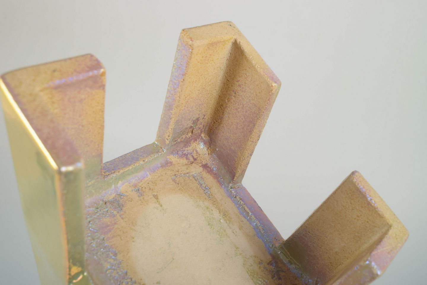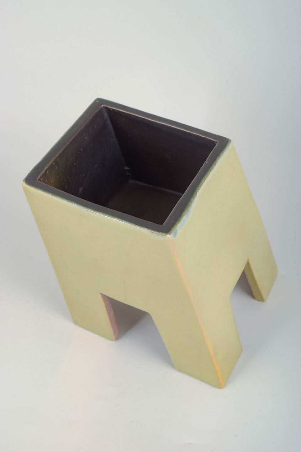 Sculptural, geometric stoneware vase with a matte, hand-glazed surface in soft muted tones. A characteristic example of Mobach’s modernist studio production, even when unsigned.