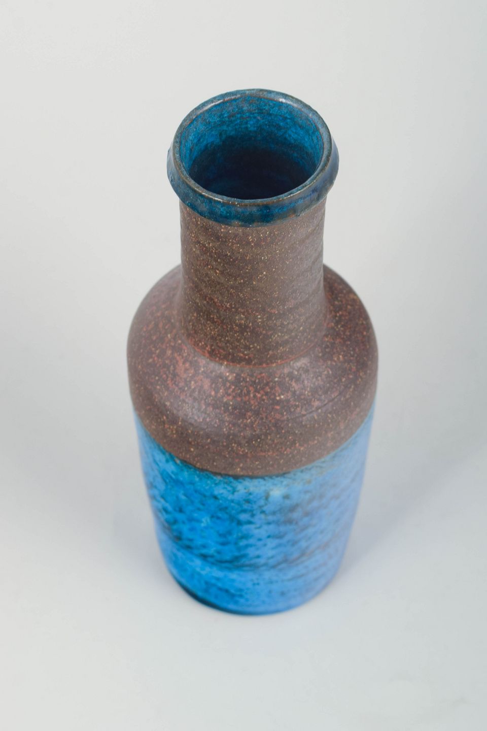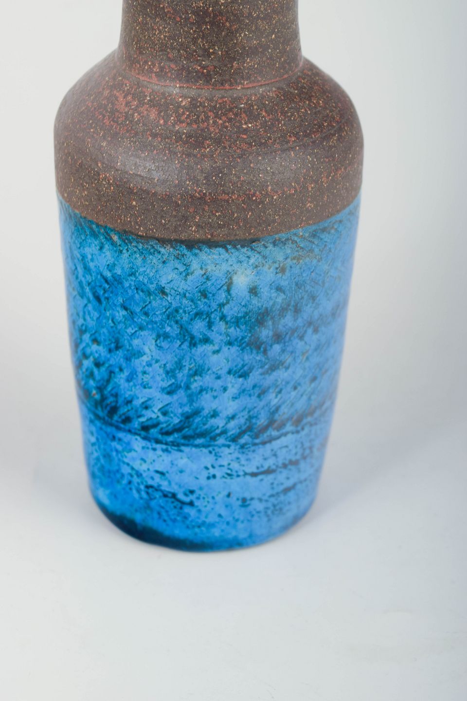 Tall cylindrical vase featuring a striking two-part glaze: the upper section in raw, textured brown stoneware and the lower section in a deep, vivid azure-blue glaze. The contrast between matte and glossy surfaces lends the piece a sculptural, modern character typical of Nils Kähler’s 1960s production.