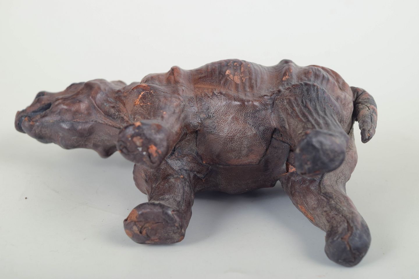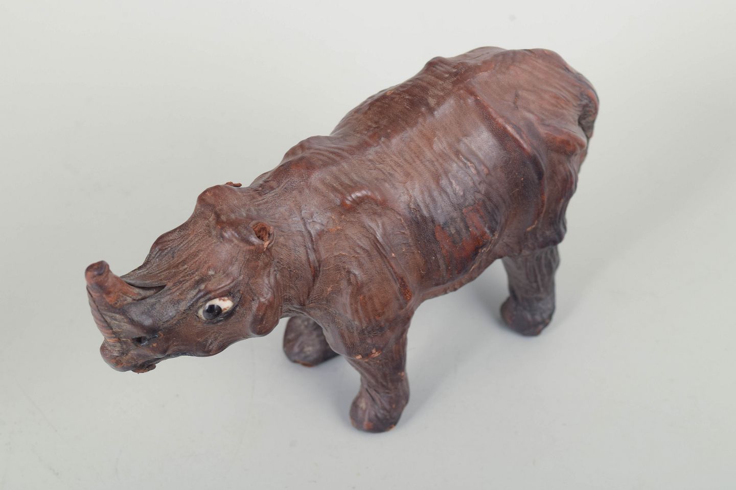 Omersa for Liberty & Co., London – Small Leather Rhino Figure, Mid-20th CenturyHandmade rhinoceros figure crafted in shaped and stitched leather, possibly retailed by Liberty & Co., London. Features modelled details, glass eyes and a dark patinated surface that enhances its artisanal character.