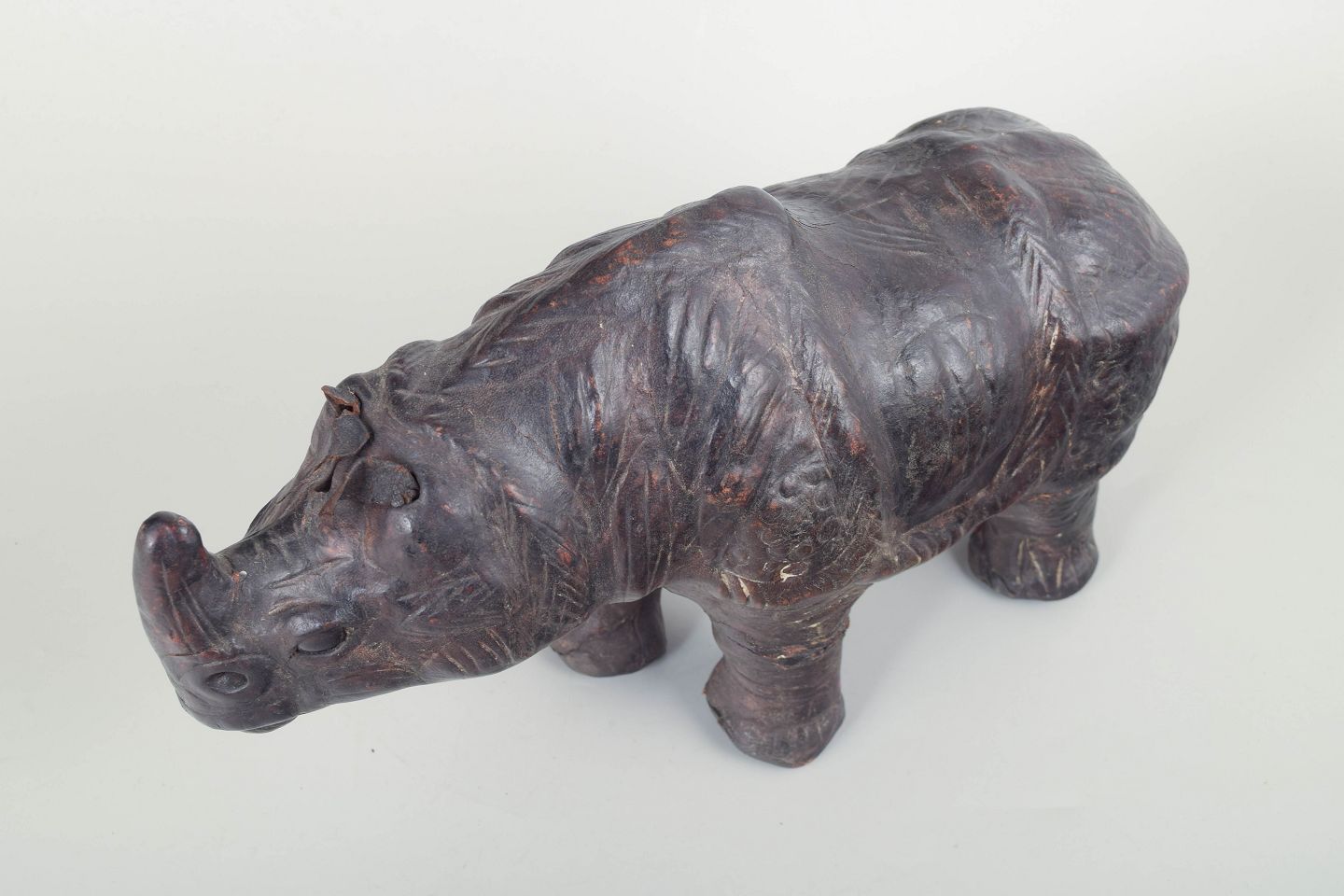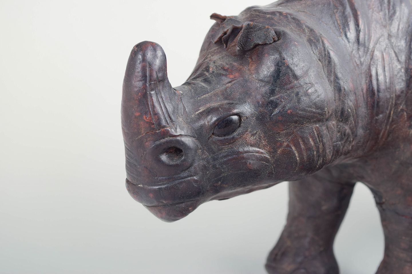 Omersa for Liberty & Co., London – Large Leather Rhino Figure, Mid-20th CenturyHandmade rhinoceros figure crafted in shaped and stitched leather, possibly retailed by Liberty & Co., London. Finely modelled details and natural patina emphasise the artisanal character of the piece.