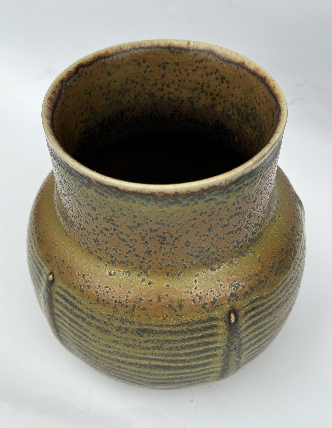 Royal Copenhagen stoneware vase. Designed by Gerd Bøgelund Covered with a green solfatara glaze. Factory first quality. Factory mark on the bottom. Artist's signature gb incised. H. 13.3 cm. In good condition. Diameter in the middle of the vase approx. 13 cm Dealer