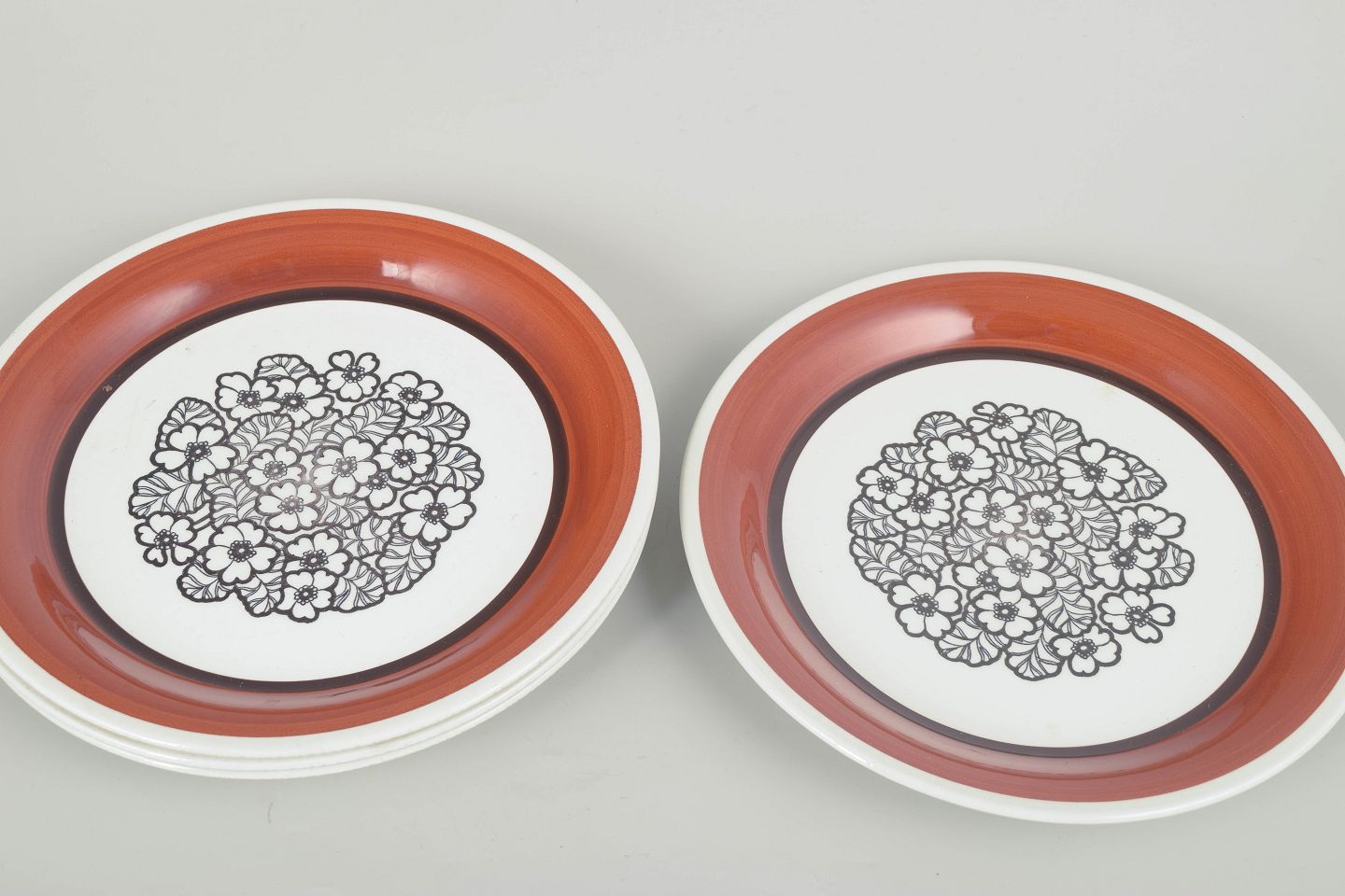 Set of 4 large stoneware plates featuring the characteristic Agneta decoration: a graphic floral cluster in black linework framed by a warm reddish-brown border. A classic 1970s Gefle design with both decorative appeal and everyday functionality.