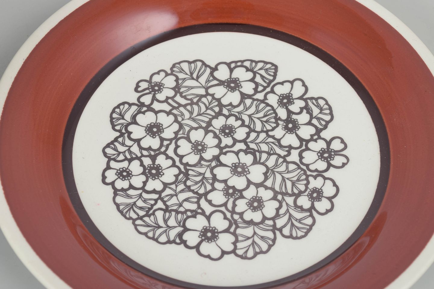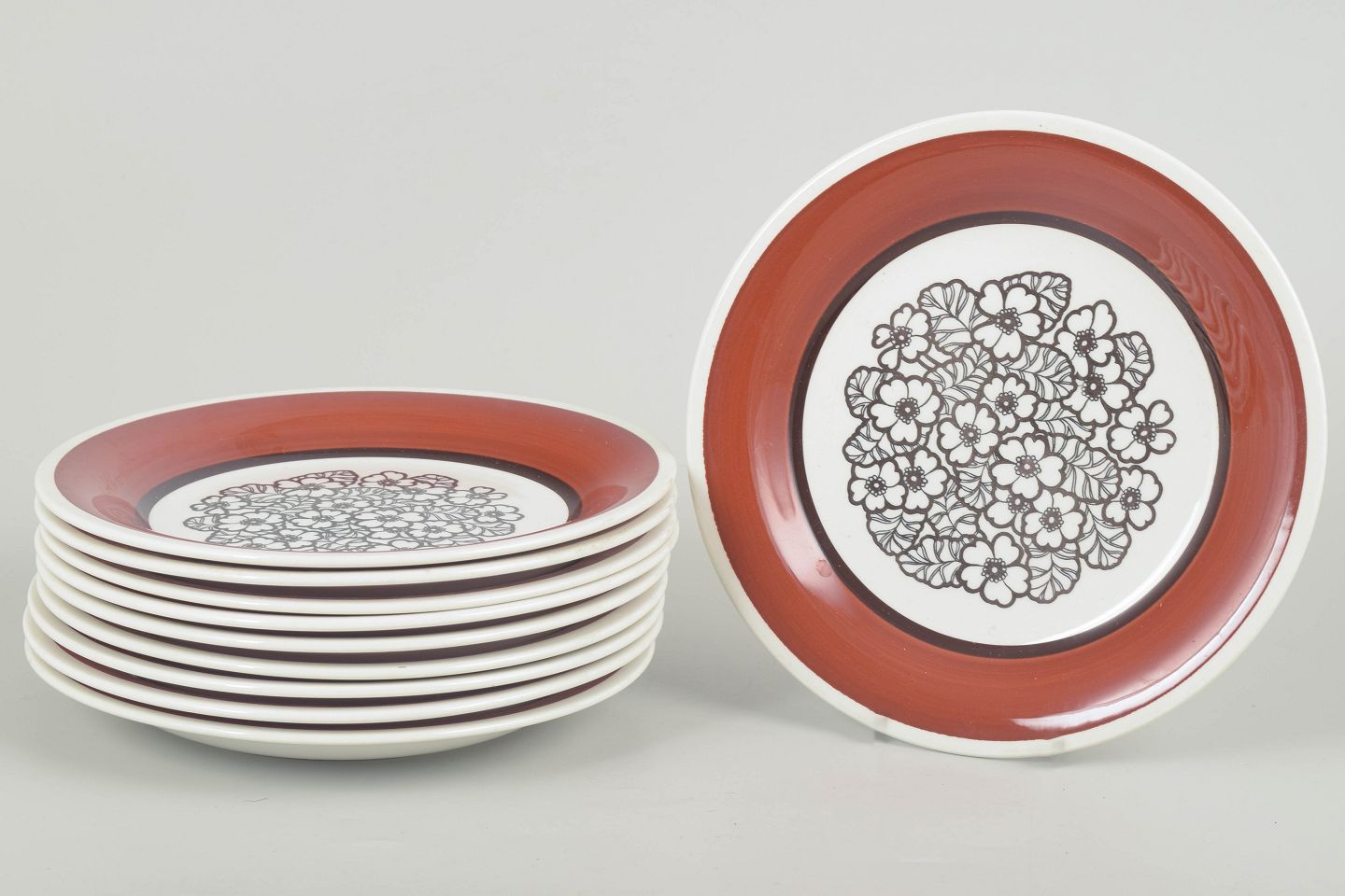 Set of 10 stoneware plates featuring the iconic floral motif in brown and black tones, characteristic of Gefle’s 1970s design language. Simple, functional forms combined with graphic decoration give the plates a warm, retro expression.