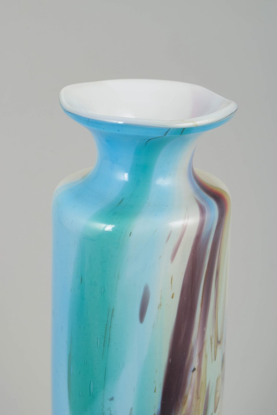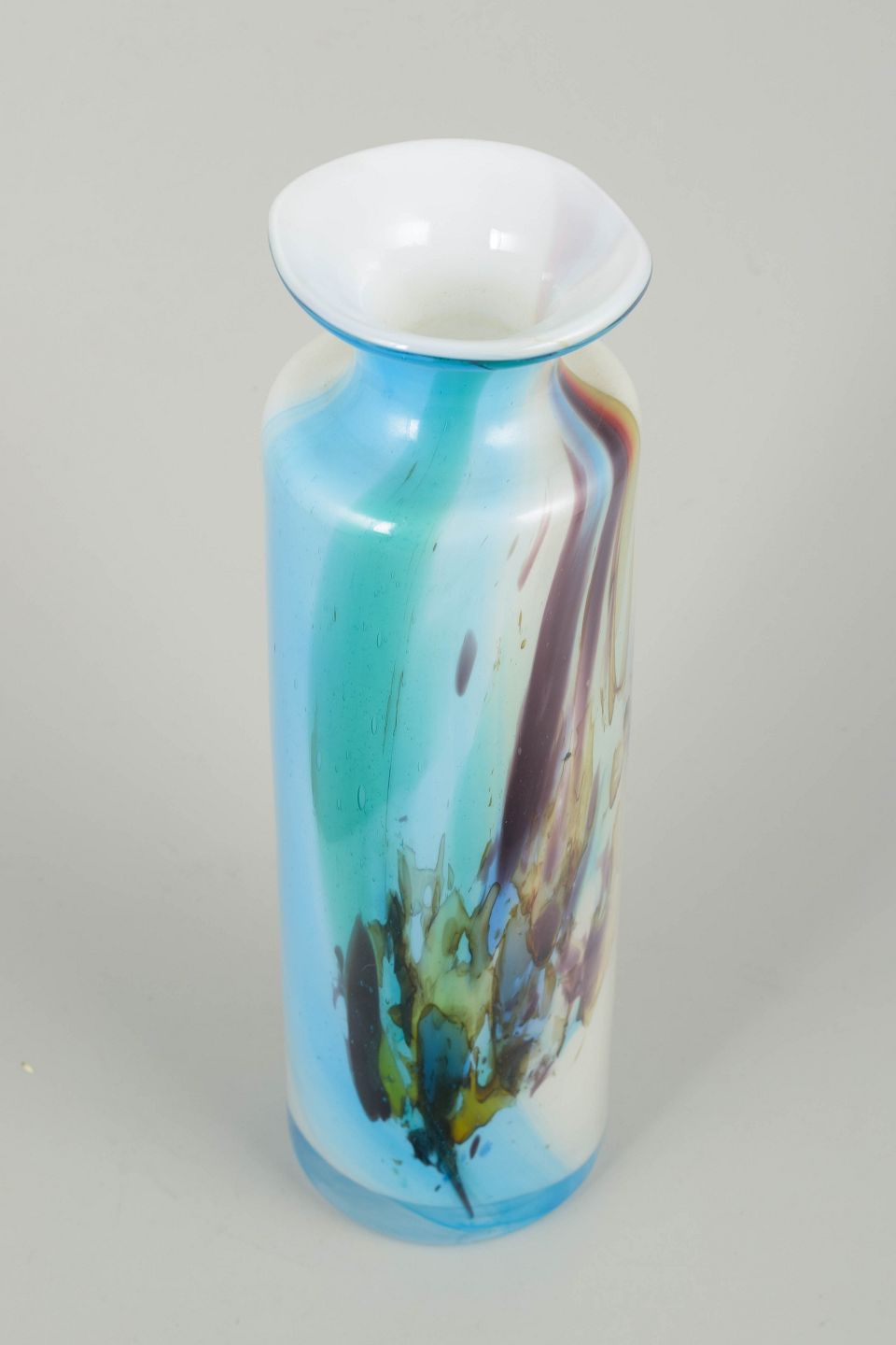 Tall mouth-blown cylindrical glass vase by Per Lütken with striking fused colour fields in turquoise, white, brown, yellow and green. The colours flow in a painterly, abstract manner, while the gently flared neck adds an elegant, sculptural touch.