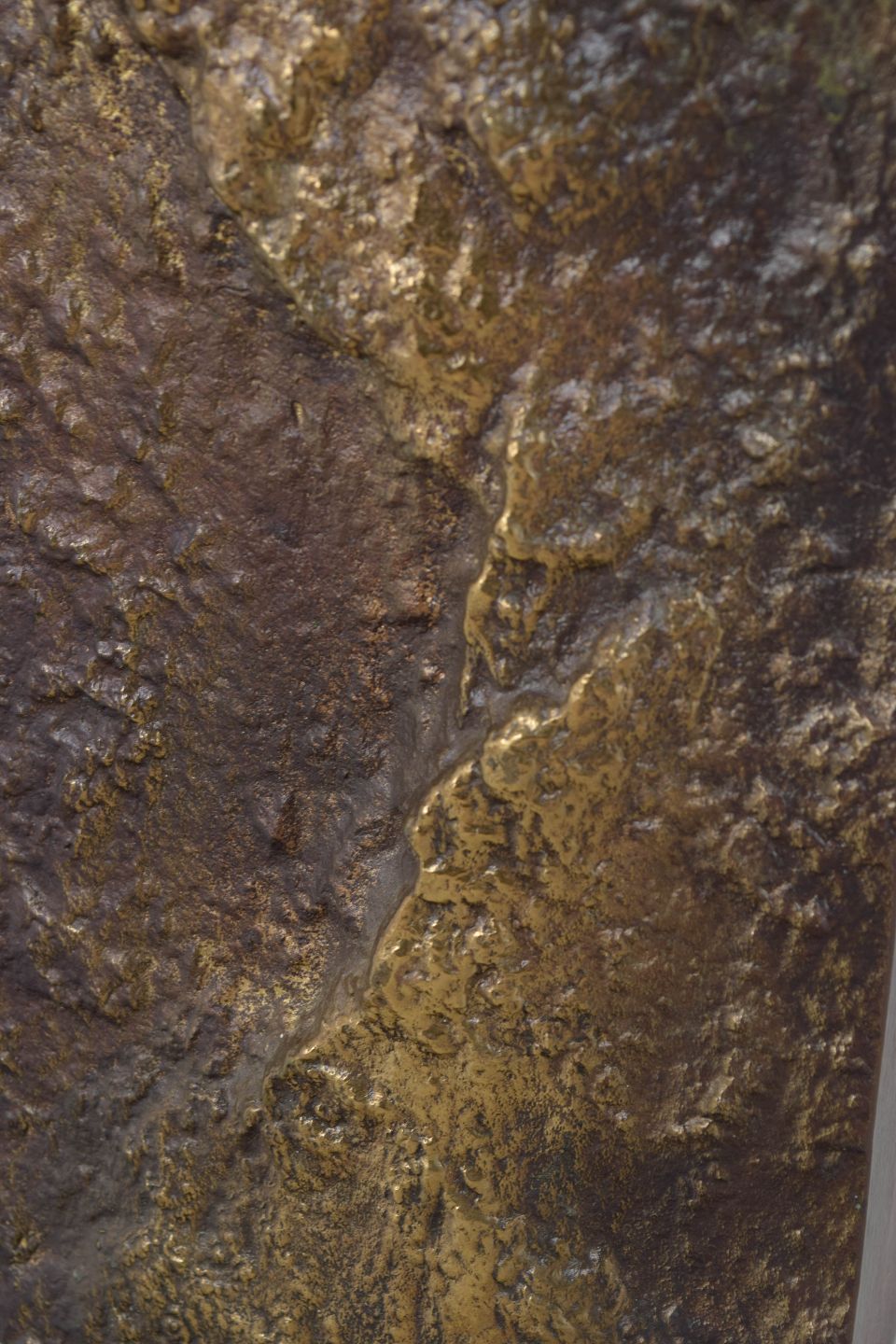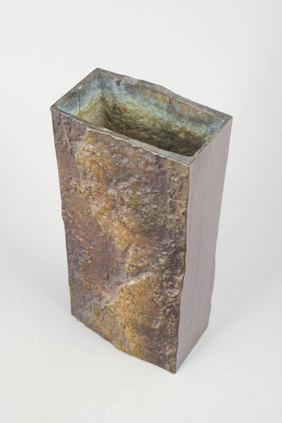 Rectangular sculptural bronze vase with a pronounced, raw textural surface contrasted by flat sides, creating a dialogue between organic relief and strict geometry. A characteristic example of Finnish 1970s metal craftsmanship with strong sculptural presence.