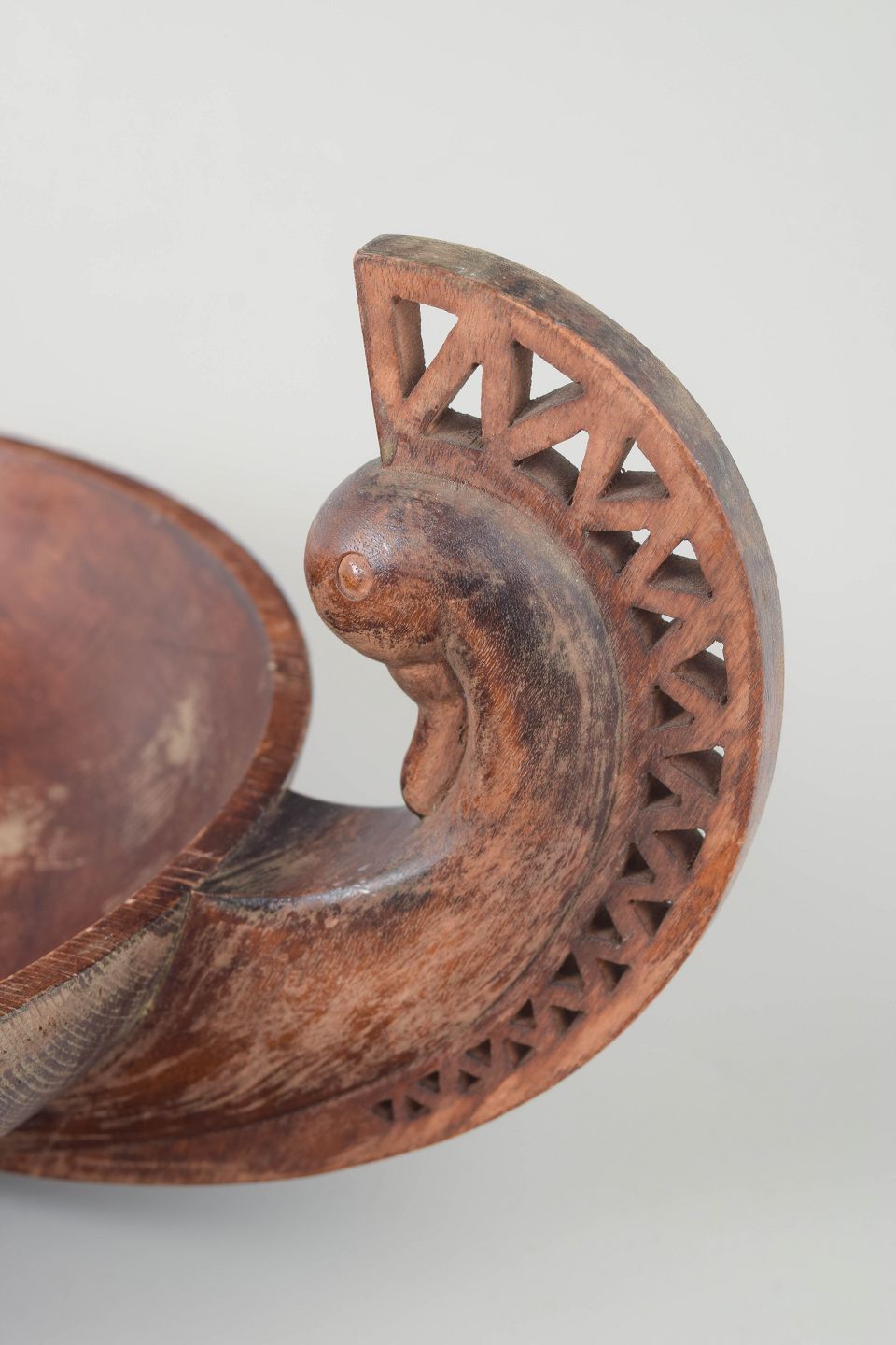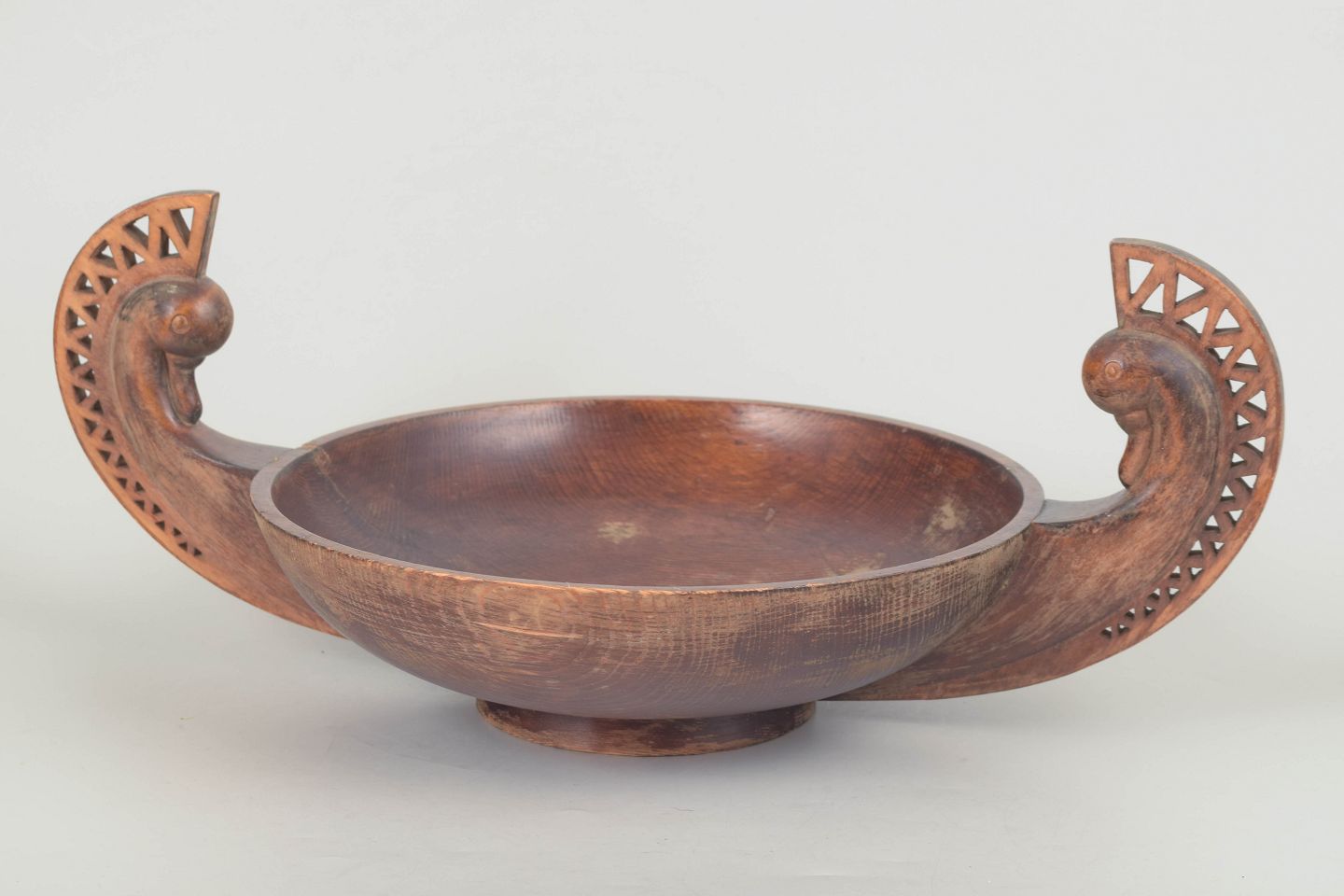 Decorative hand-carved wooden bowl featuring the characteristic dual bird-head terminals—an iconic motif closely associated with Kalevala Koru’s early design language. The warm patina and finely pierced details highlight Paaer’s ability to merge Nordic ornamentation with functional craftsmanship.
