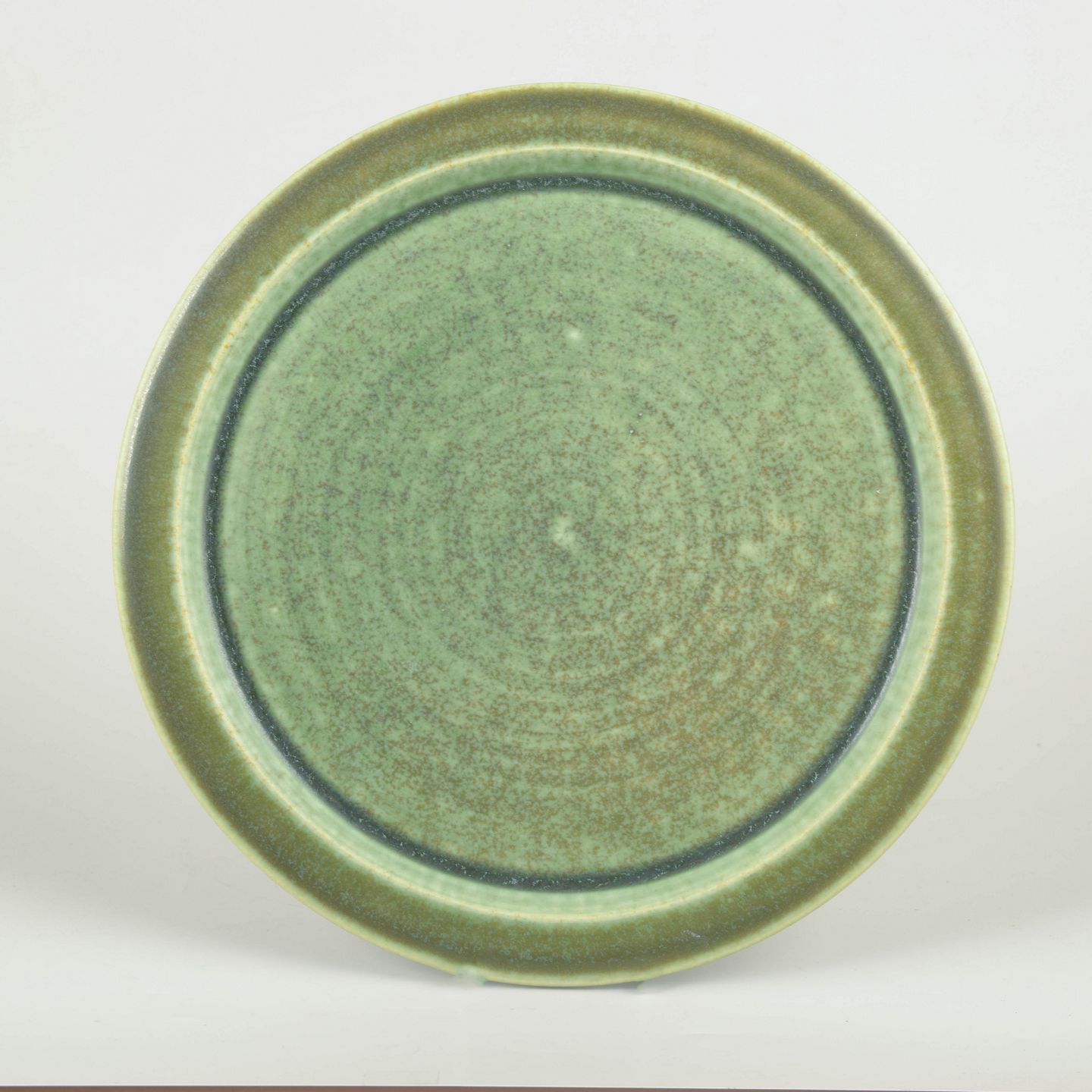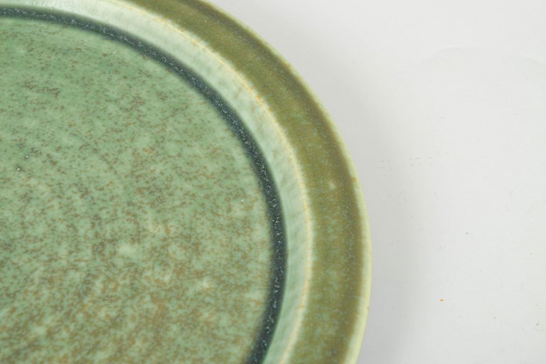 Large, simply shaped stoneware dish in the classic Saxbo style, featuring the characteristic matte, nuanced green glaze. The calm form and deep tonal quality reflect the workshop’s refined modernist aesthetic.