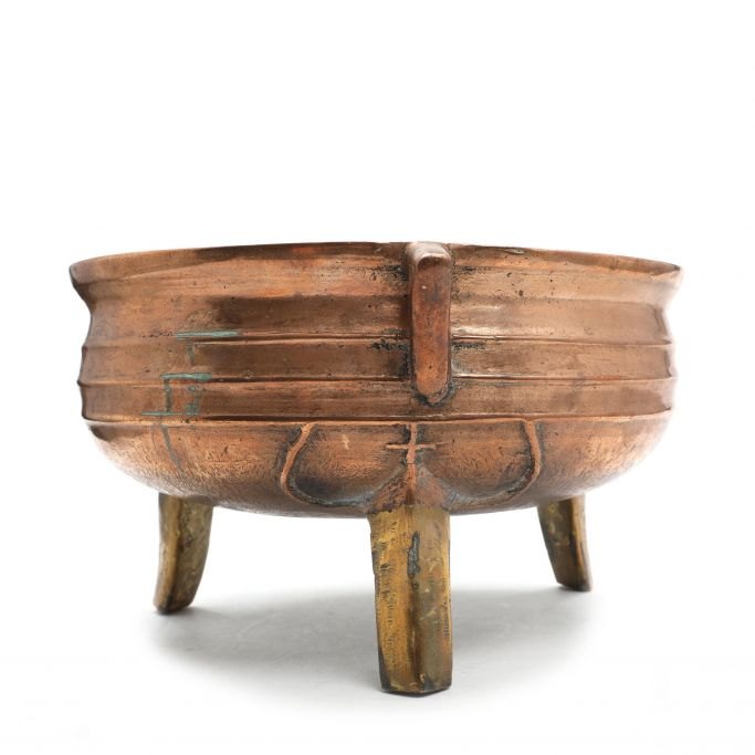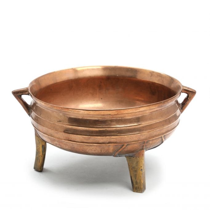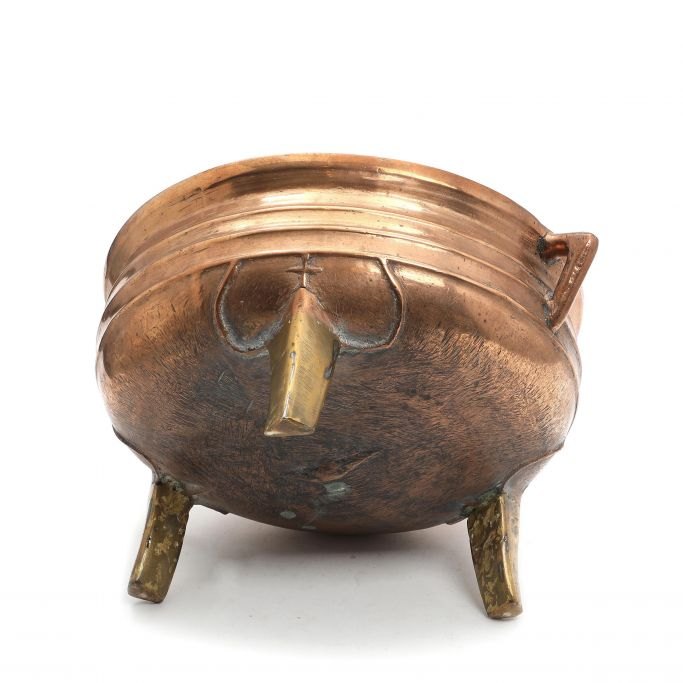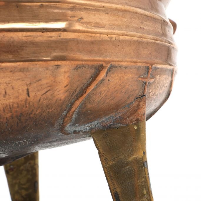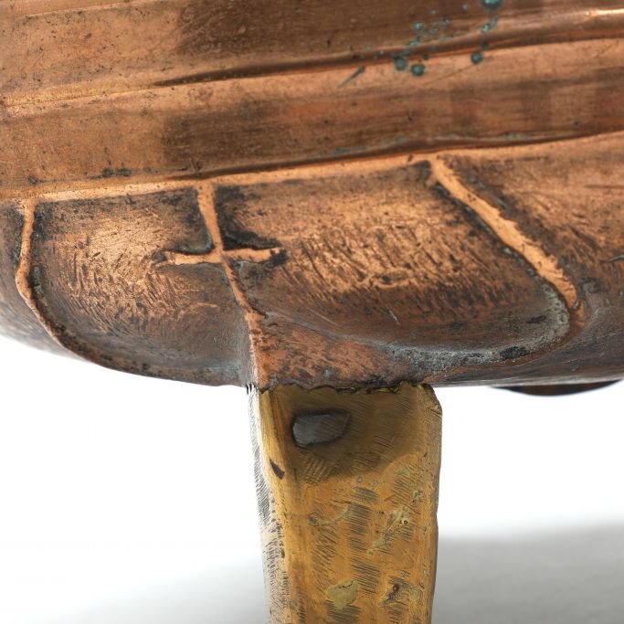 Renaissance three-legged pot of ore, 15th/16th century. With decorations on the sides including ribs. Repaired. Three legs were added later in brass. The pot has been recently polished. H.: 18.5 cm. Dia.: 31.5 cm.Certainly North German work. The cross at the legs is probably the foundry's mark.