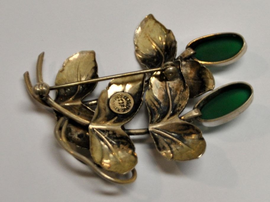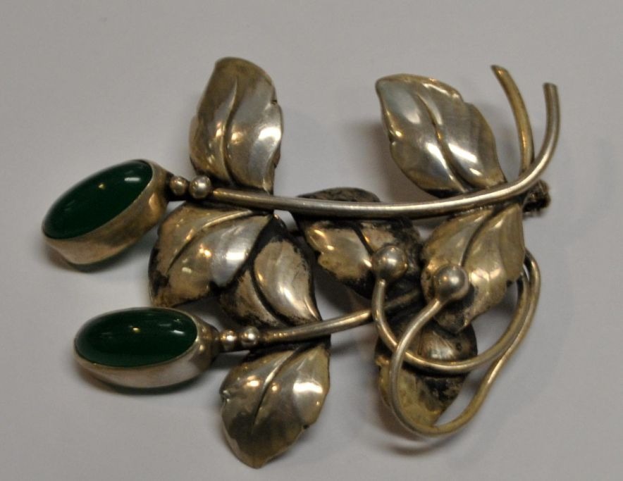 Karin Borup, Copenhagen - Birkerød (2010 - ): Brooch in sterling silver. With two green stones. Stamped: COP. 6 x 5 cm.Item number: 28714