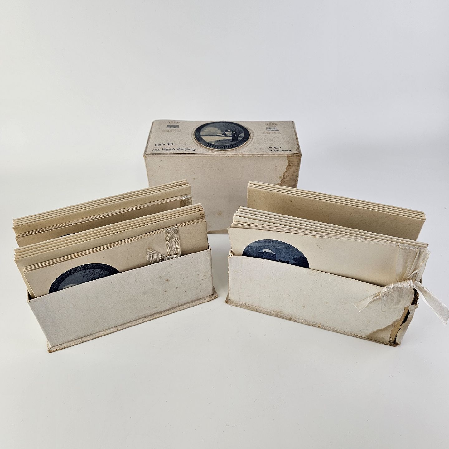 Brevkort med motiv af juleplatte fra 1923 fra Bing & Grøndahl og Royal Copenhagen. 10 kort og 10 kuverterSerie 108