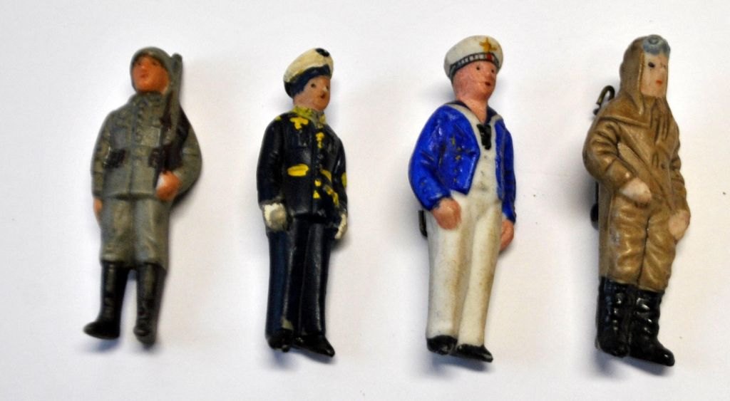Collection of German bisque hand-painted military brooch figures, circa 1933. Figures depicted: A soldier, airman, sailor and captain in the navy. H.: 4.5 cm.Only sold together!