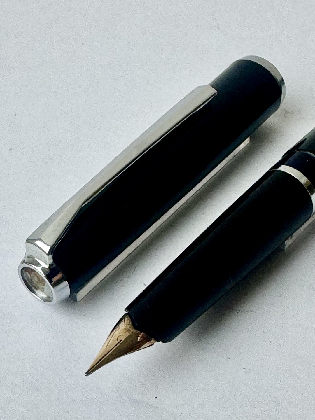 Vintage back Pelikan Silvexa 20 fountain pen with chrome-plated parts. Cartridge filling system. Made in Germany in the mid-1960s. A new refill must be inserted before it can write again. Length: 13.4 cm