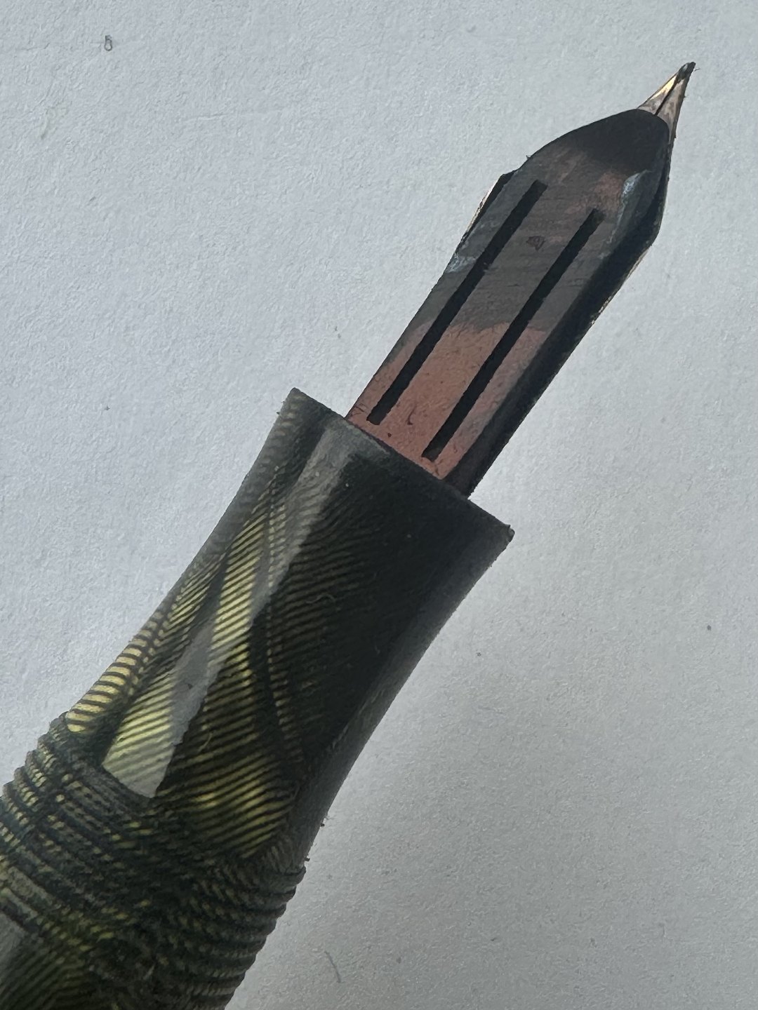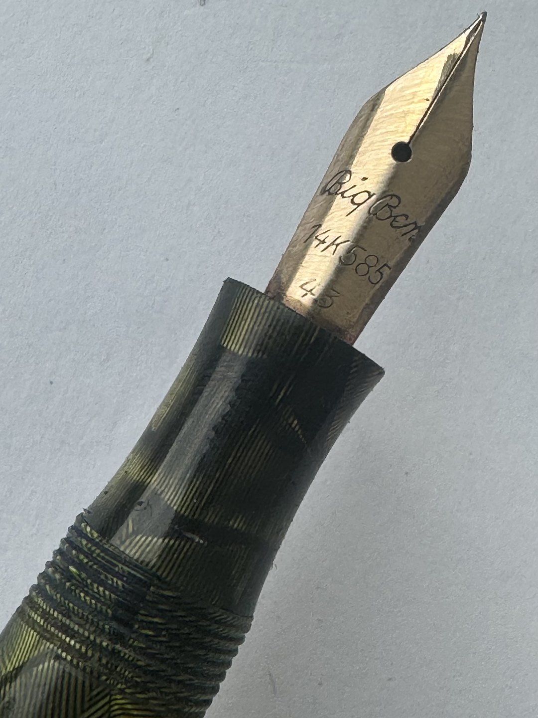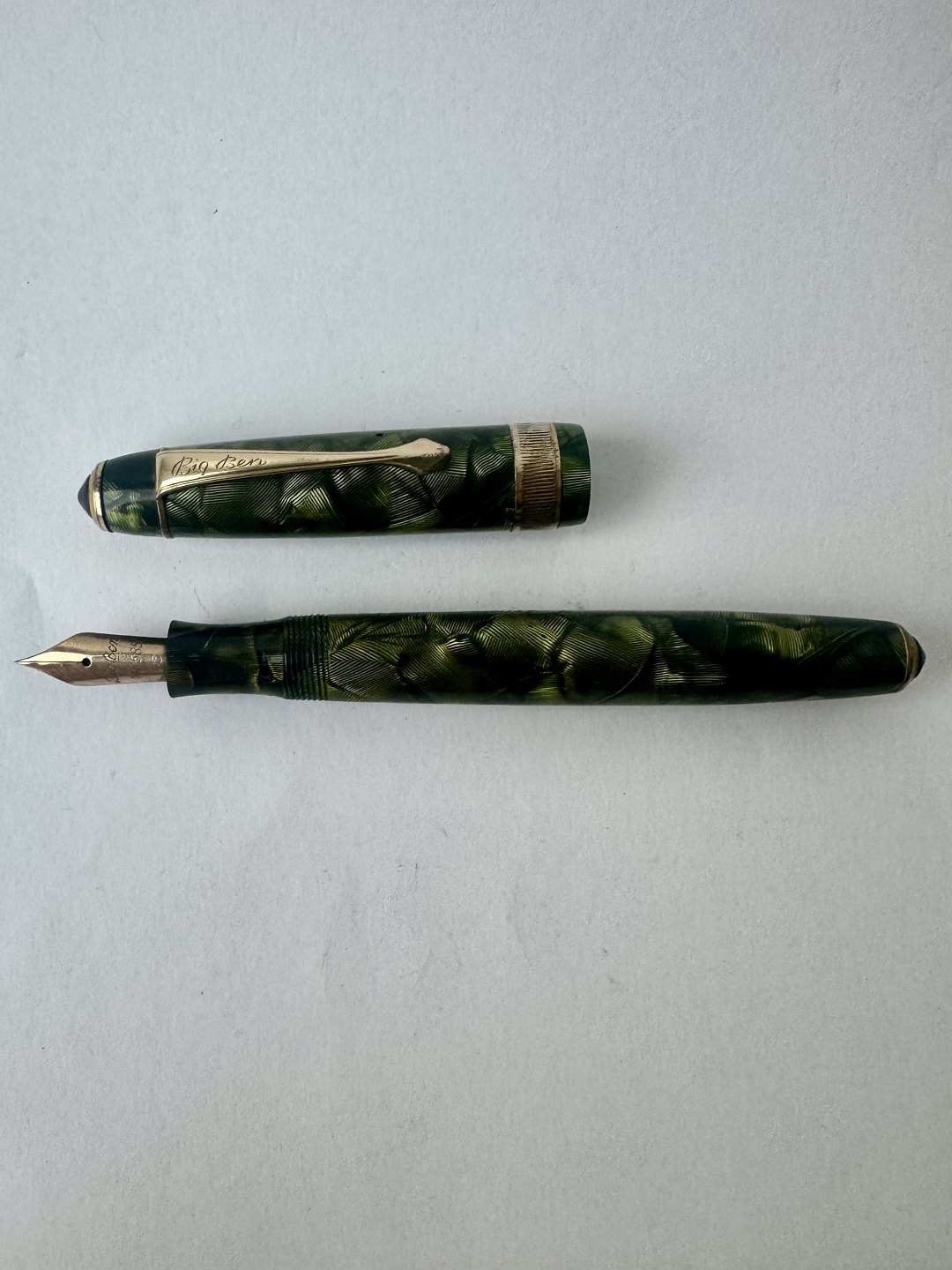 Large green marbled Big Ben fountain pen With wide ribbed belly band on the cap. Appears in good condition with all original Big Ben parts, including a 14 carat gold nib. Before the fountain pen can absorb ink and write again, a new rubber bladder must be inserted. This task can be carried out for an additional charge of DKK 200. Length: 13.6 cm