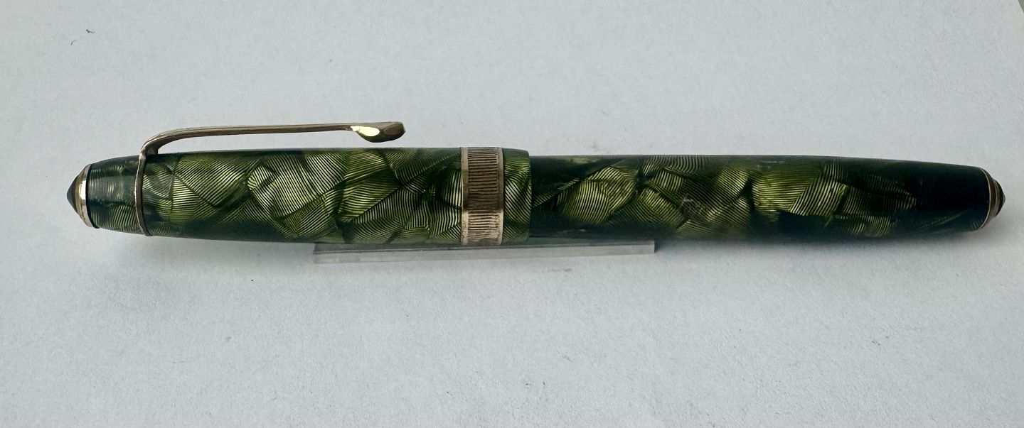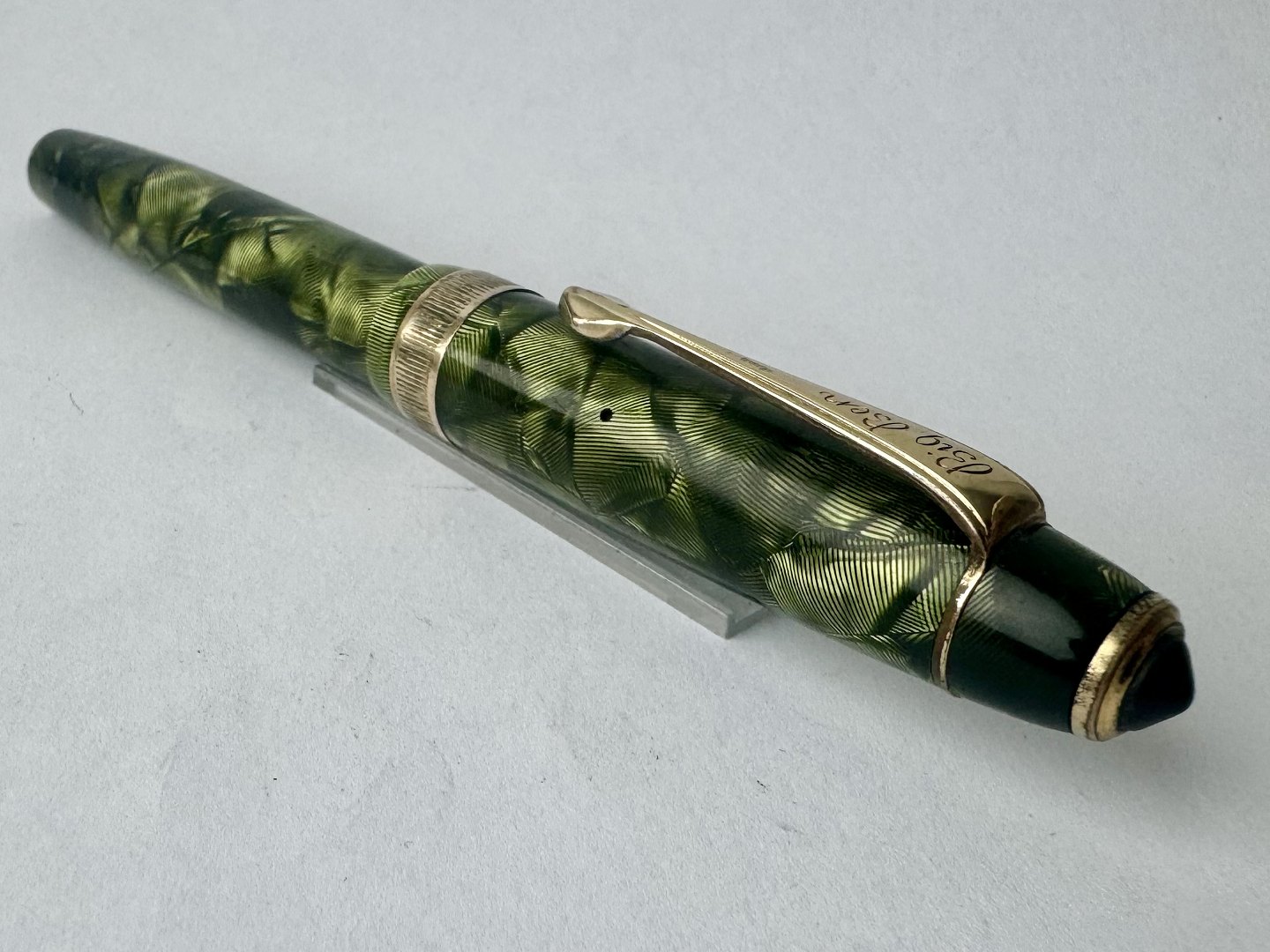 Large green marbled Big Ben fountain pen With wide ribbed belly band on the cap. Appears in good condition with all original Big Ben parts, including a 14 carat gold nib. Before the fountain pen can absorb ink and write again, a new rubber bladder must be inserted. This task can be carried out for an additional charge of DKK 200. Length: 13.6 cm Dealer