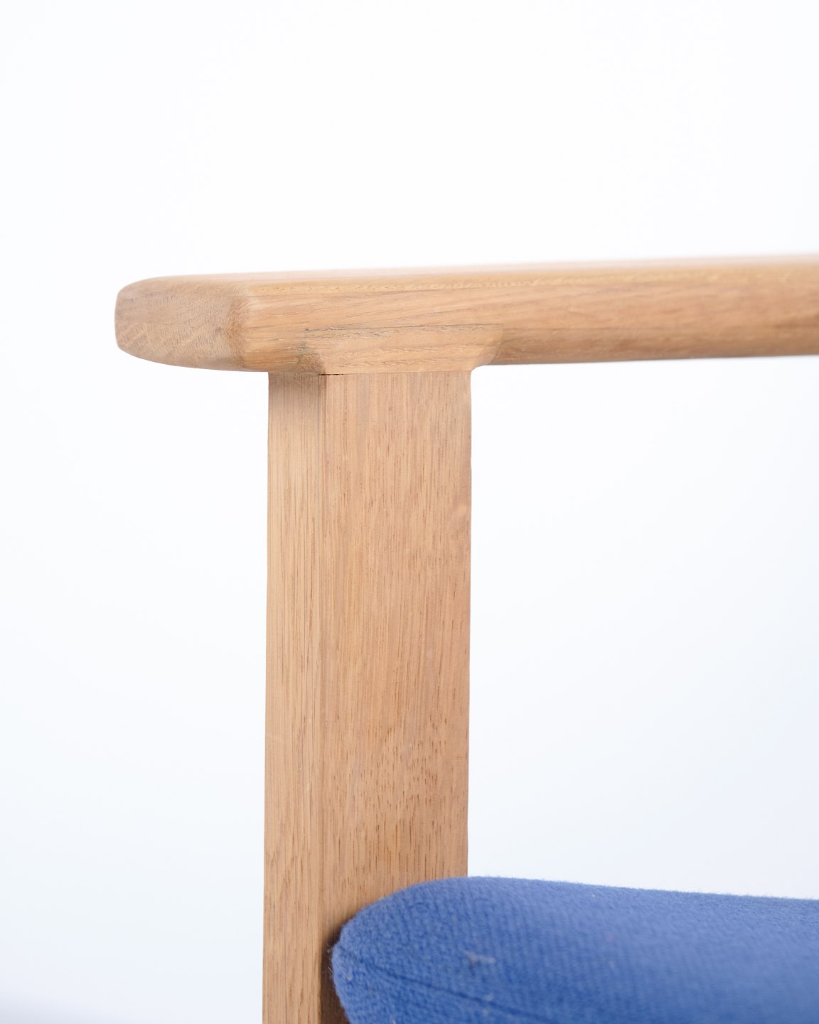 Lounge chair model GE 284 designed by Hans J. Wegner and produced by Getama. Made with a solid oak frame and loose cushions upholstered in blue wool. A classic Wegner design offering comfort and a compact form suitable for both modern and traditional interiors.— Designer: Hans J. Wegner