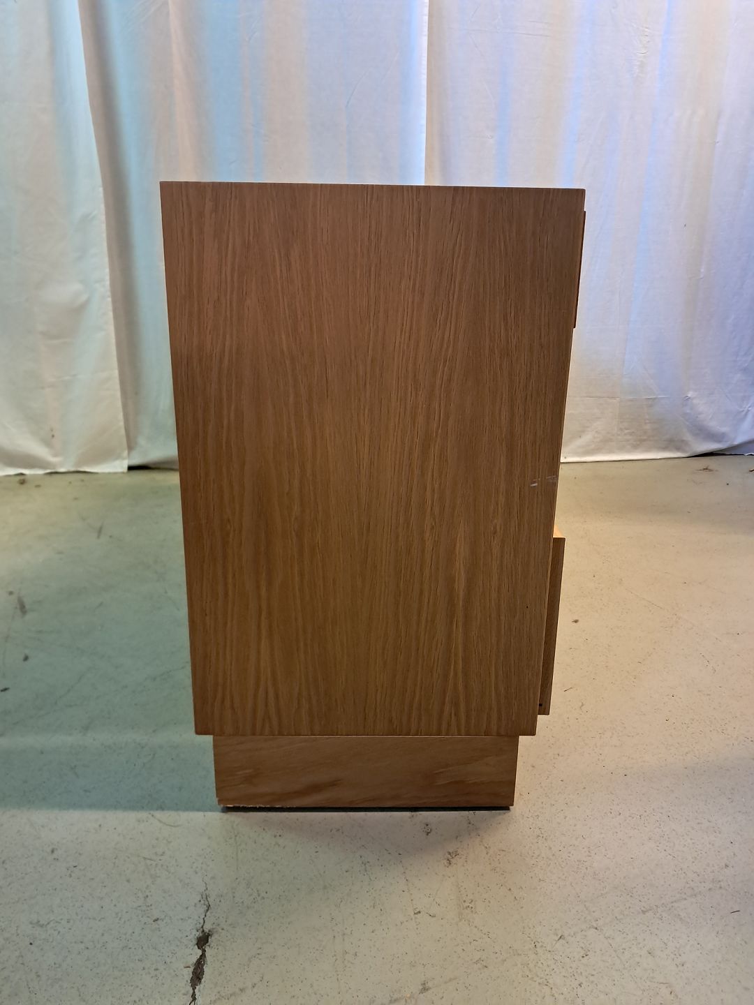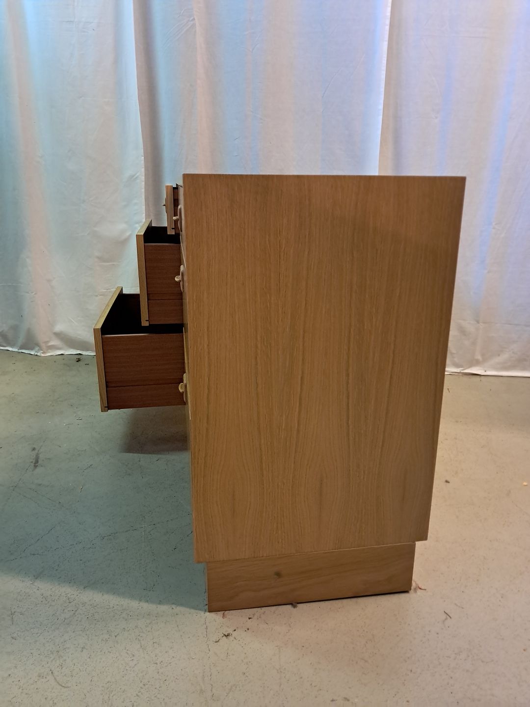 Kommode i fineret egetræ, fra 1980erne.Den har brugsspor og en defekt på soklen.
