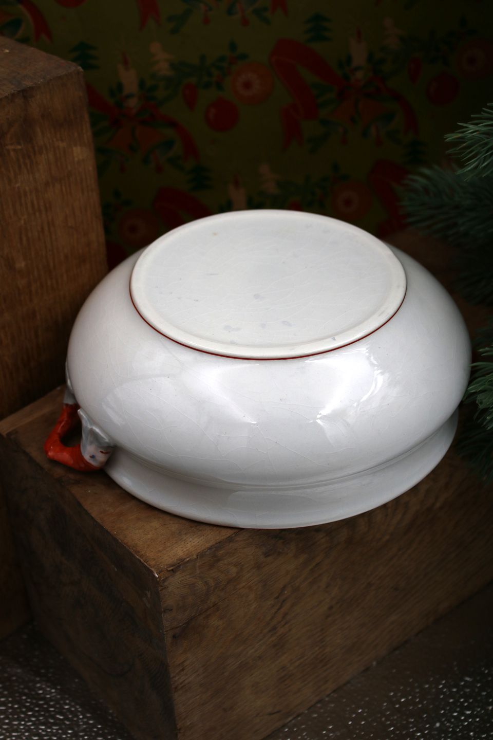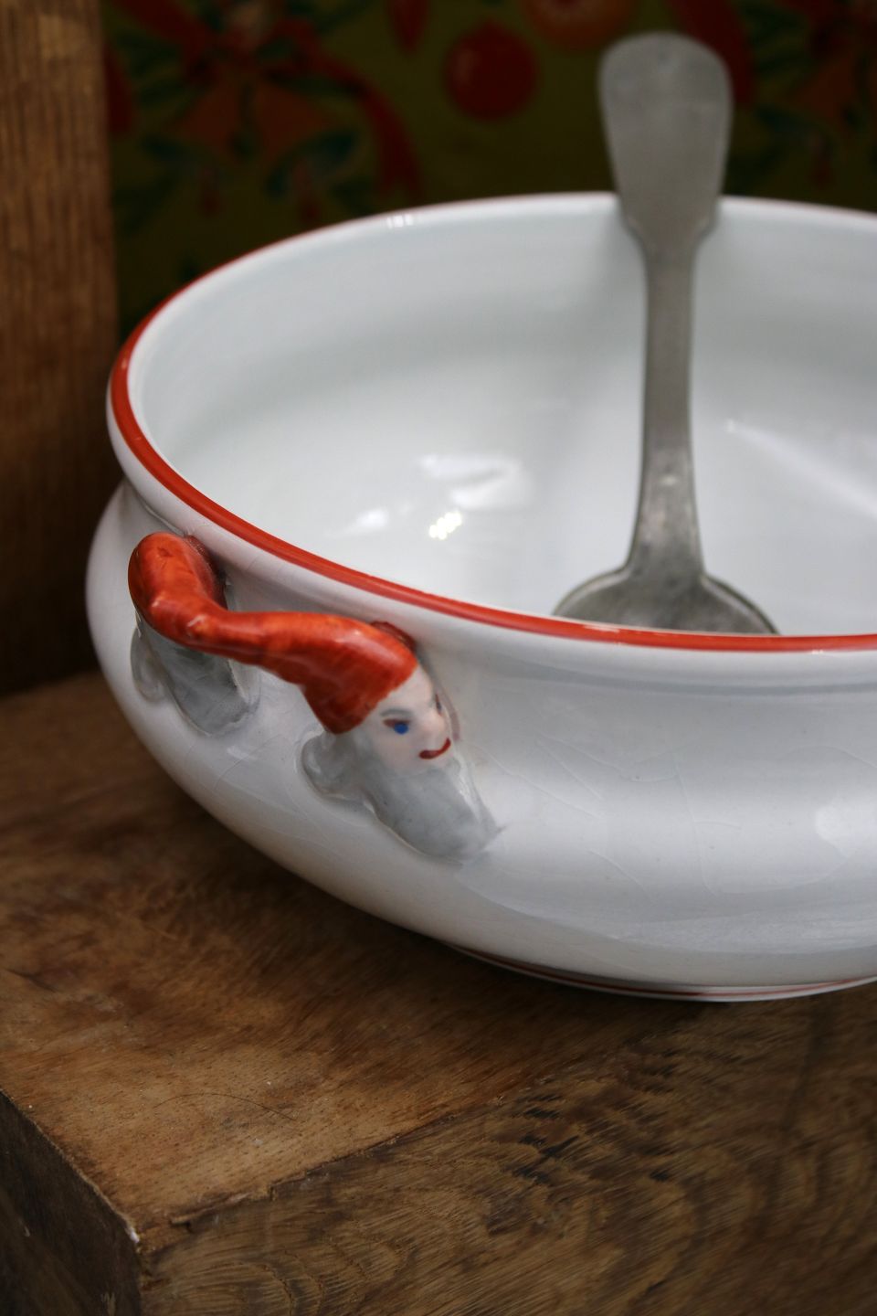 Old Swedish Christmas bowl in faience with a gnome on the handles.H: 7.5 cm. Dia.: 20cm.