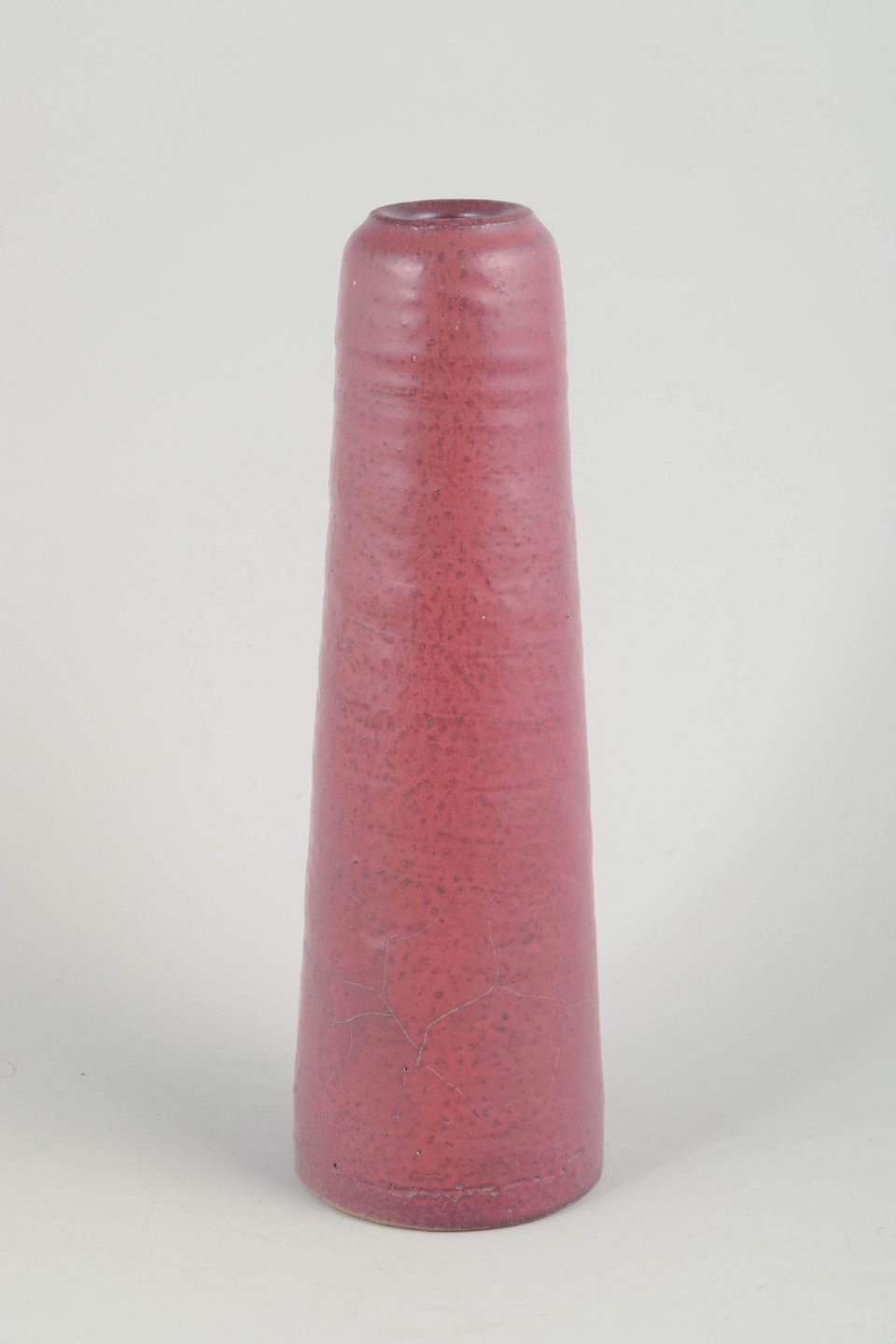 Large, hand-glazed vase in the classic Mobach style with a cylindrical, gently tapered form and a deep red glaze with subtle surface variation. A striking and decorative piece from the workshop’s 1970s production.