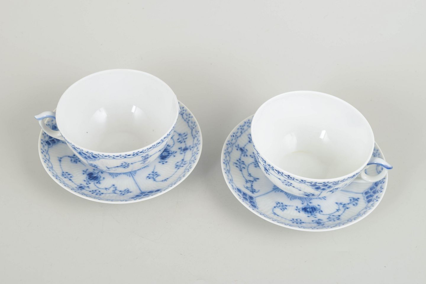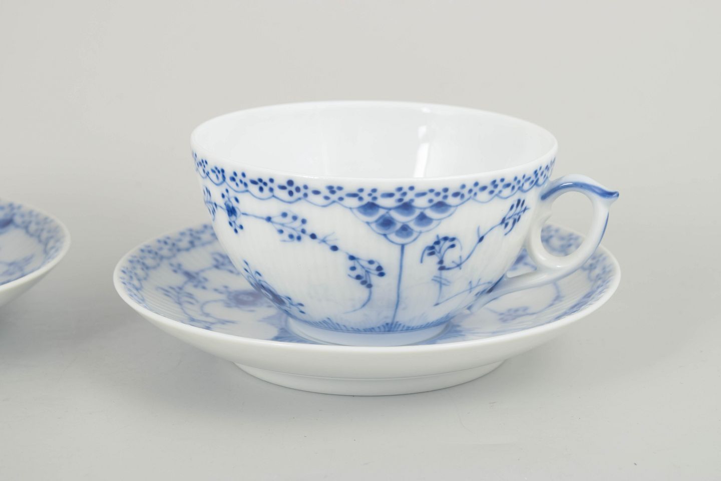Tea cups in Blue Fluted Half Lace, hand-painted porcelain. The classic blue decoration and generous cup shape make this a popular form within the series. One cup has two surface scratches, while the other pieces are 1st quality.