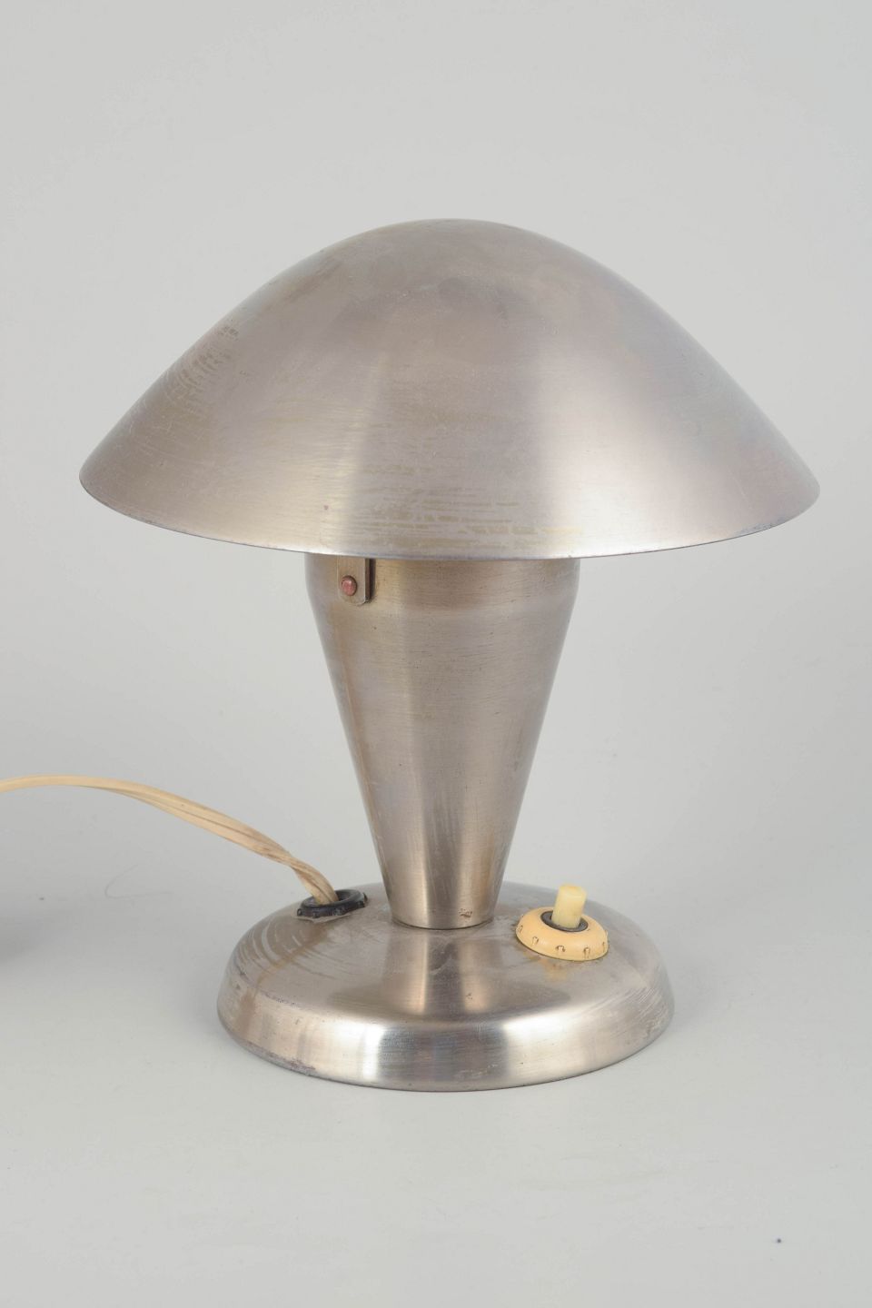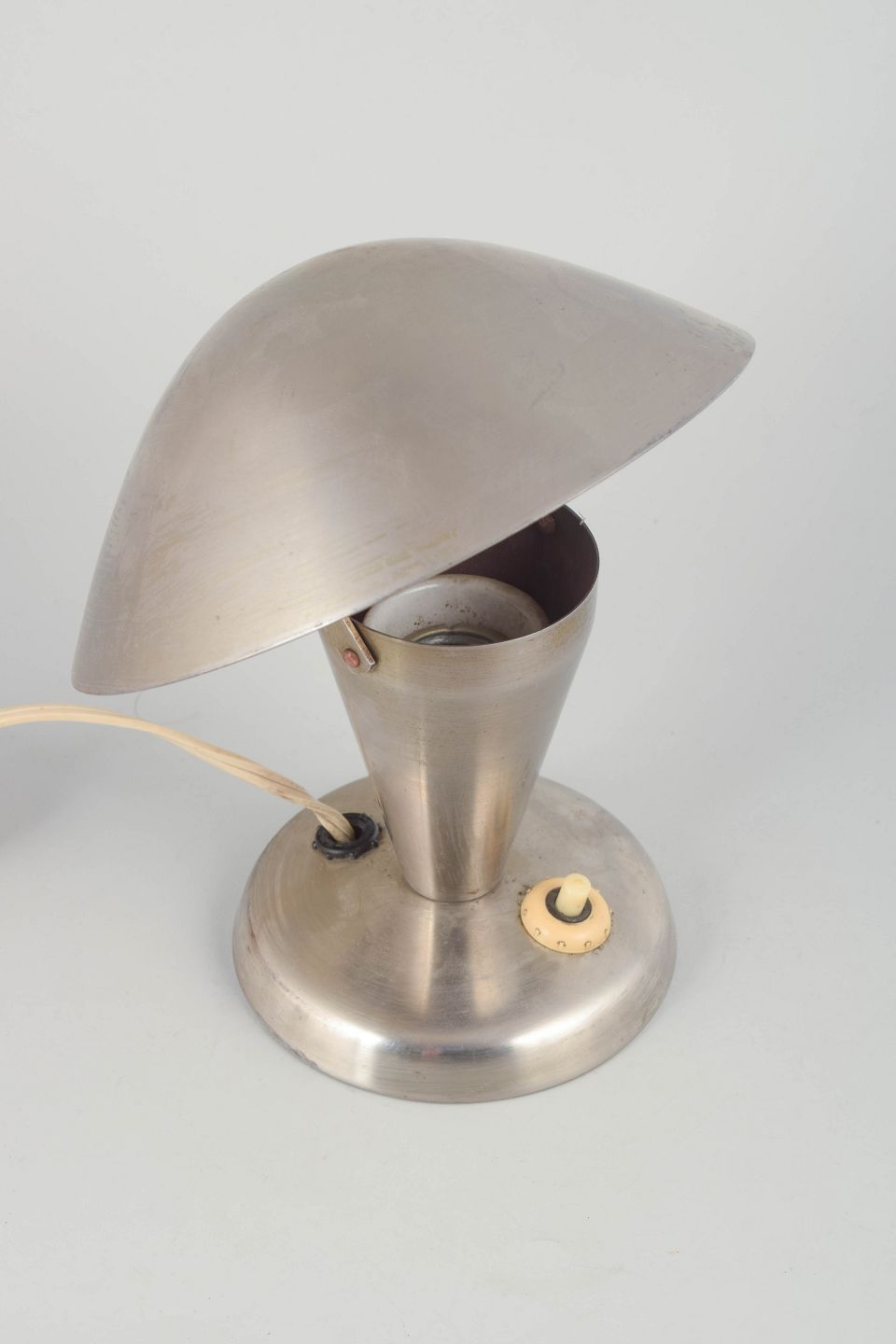 Early modernist table lamp in brushed steel with a mushroom-shaped shade and conical base. A characteristic example of Czech functionalist lighting design from the interwar period, defined by clean lines and industrial materials.