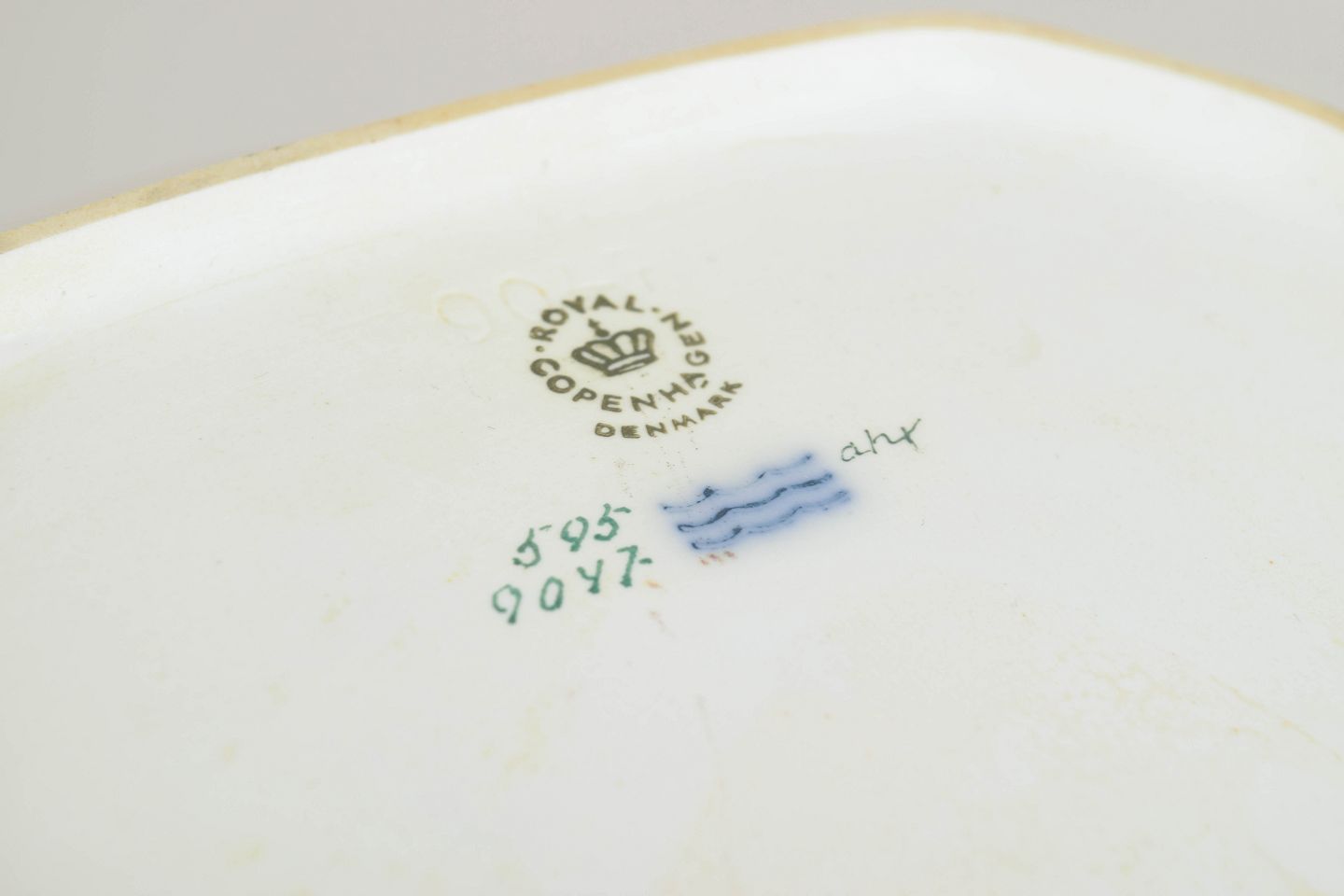 Beautiful octagonal porcelain cake dish from Royal Copenhagen’s “Golden Basket” series, model 595/9047. Features a wide gilded rim, hand-painted floral basket motif at the centre, and decorative floral sprigs.