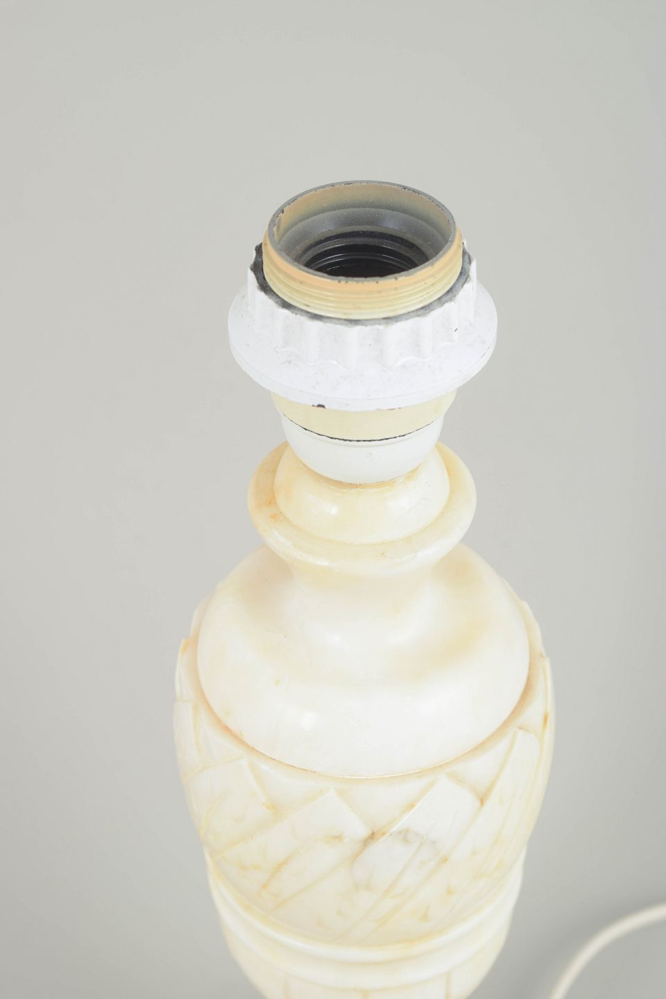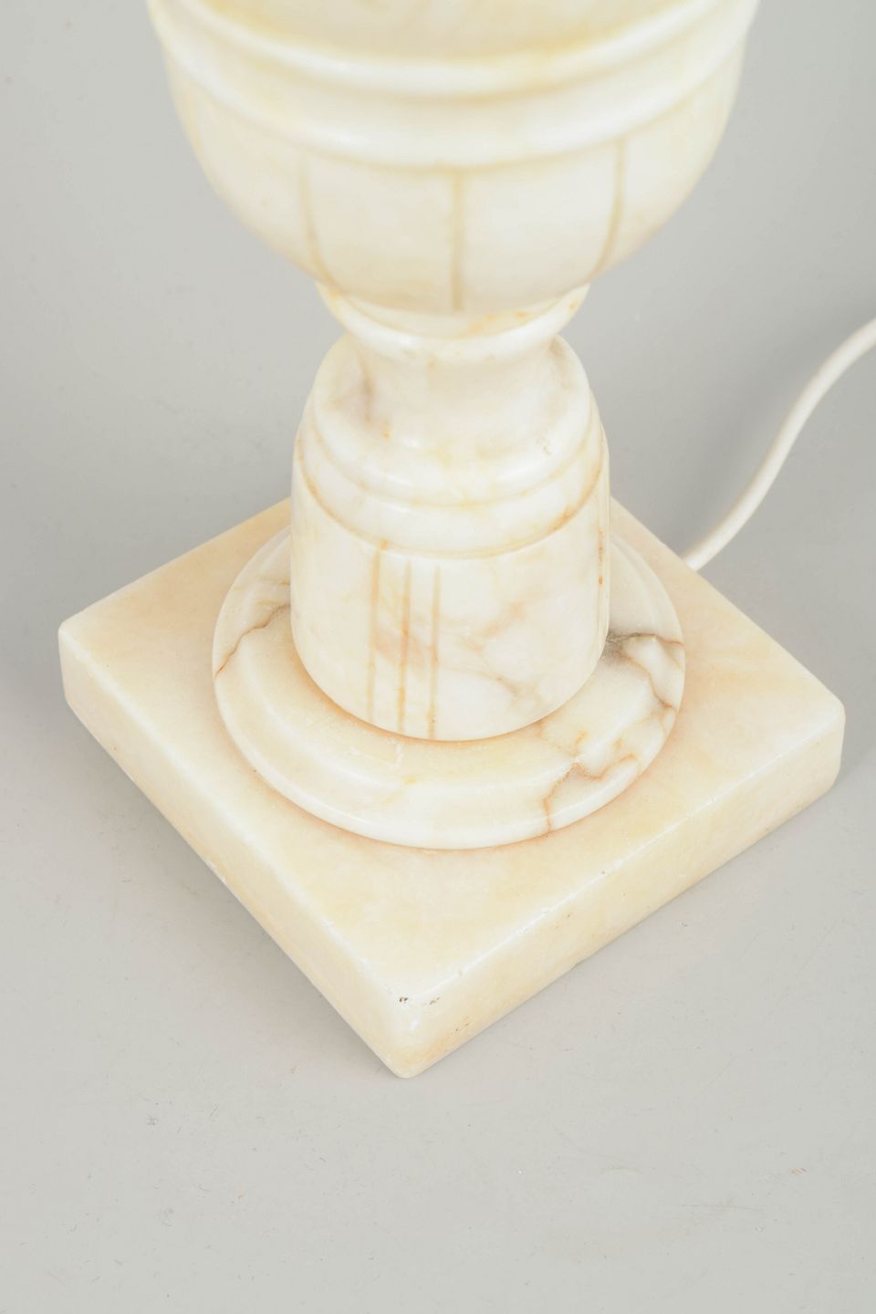 Decorative table lamp in light marble featuring carved diamond and vertical facet patterns that lend a classic, elegant form. The square base and soft proportions enhance the lamp’s sculptural presence.