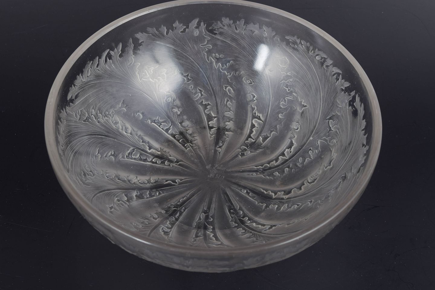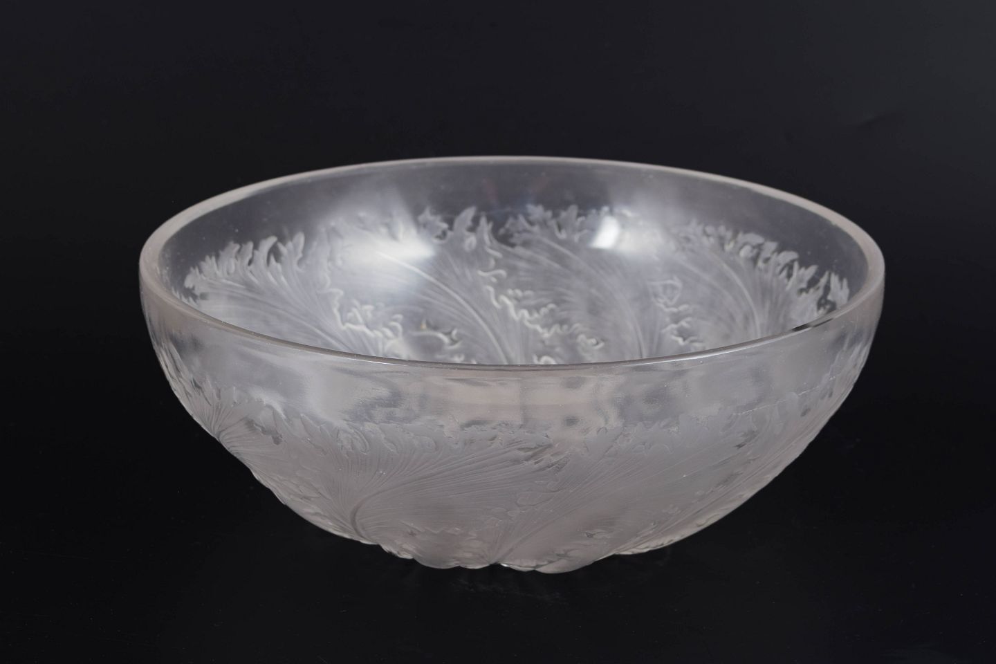 Art Deco bowl in frosted and polished glass featuring large, curved feather-leaf reliefs, a classic early Lalique motif. The interplay between matte and clear surfaces enhances the sculptural depth of the design.