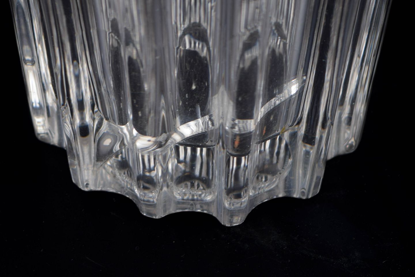 Art deco clear glass vase with pronounced vertical ribbing and a softly scalloped rim, executed in the recognisable style associated with Pierre d’Avesn’s decorative glass designs. The structured surface combined with the organic top creates an elegant, sculptural presence.