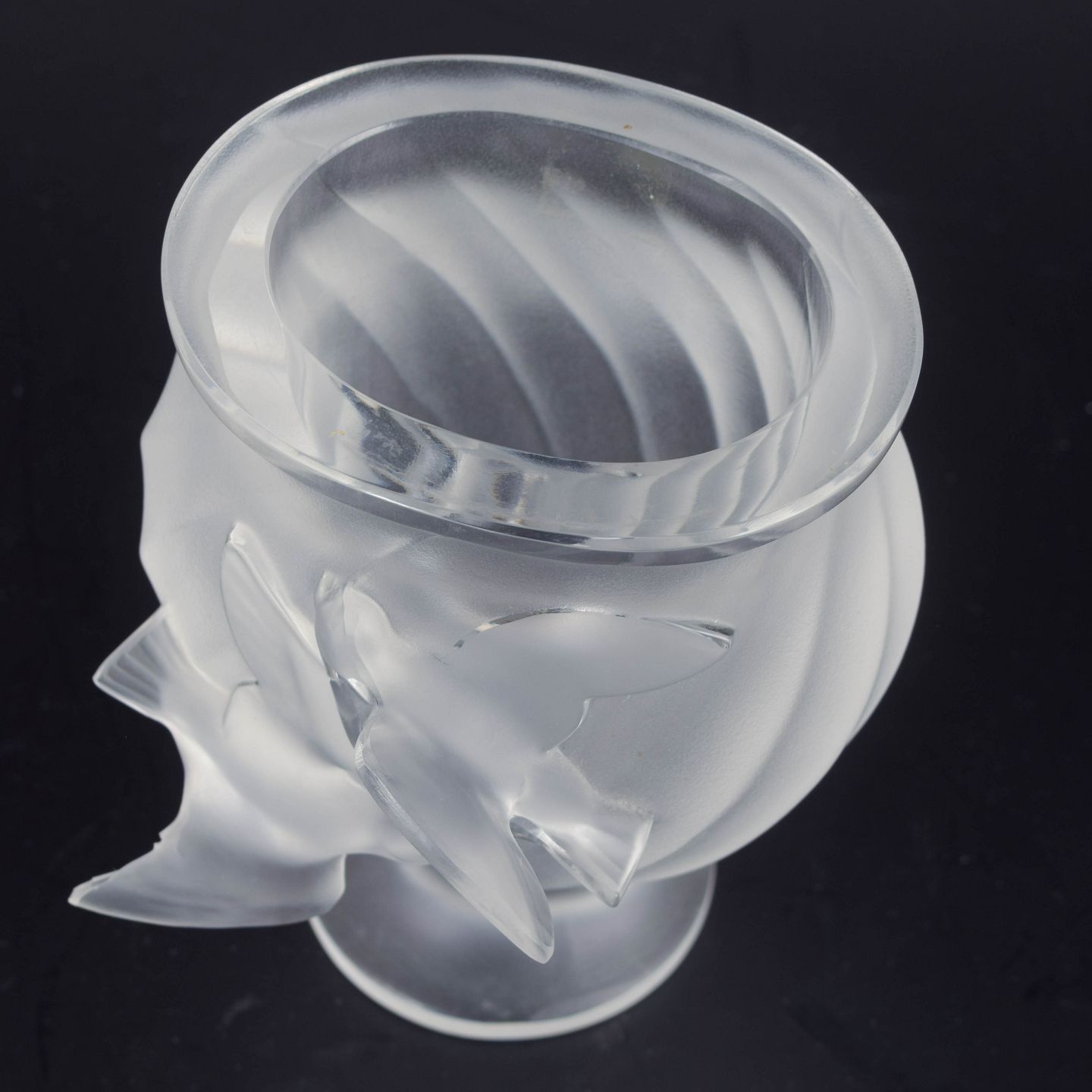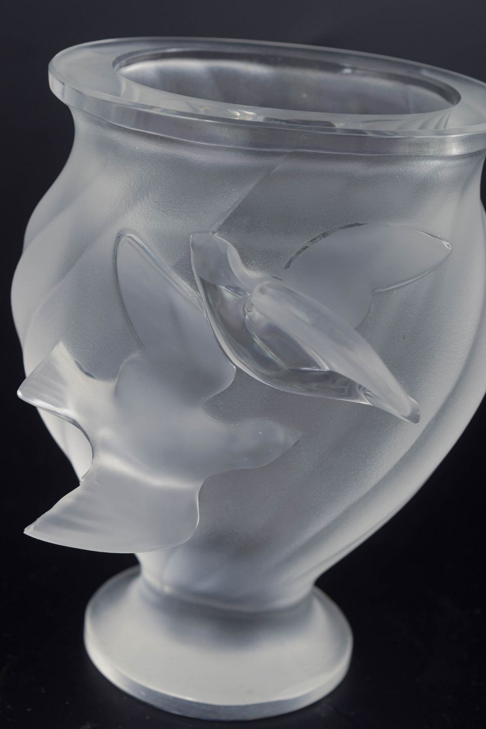 Frostet krystalvase med relief af to svævende svaler, et klassisk motiv i Lalique-traditionen. Den matte overflade og organiske form skaber et elegant lys- og skyggespil.