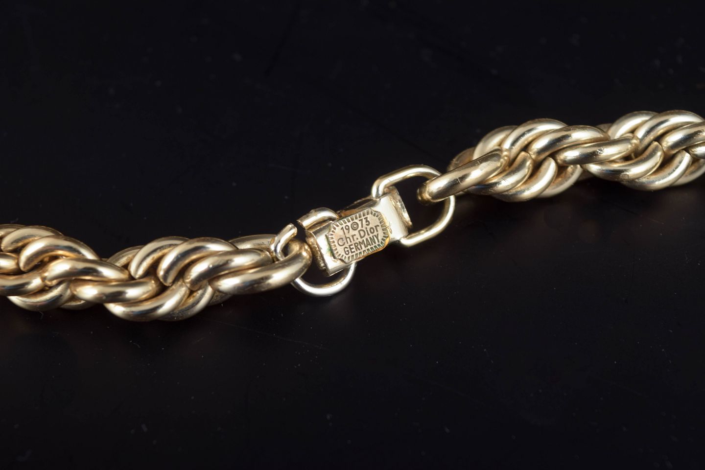 Elegant, heavy twisted chain in gilt metal, executed in Dior’s signature 1970s style. A bold and luxurious piece with a warm glow and strong period character. Length approx. 85 cm.