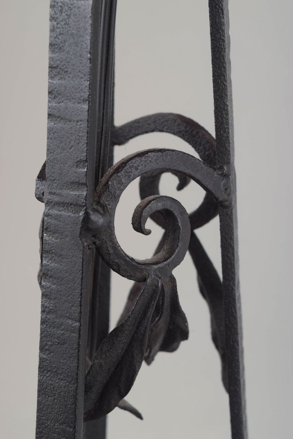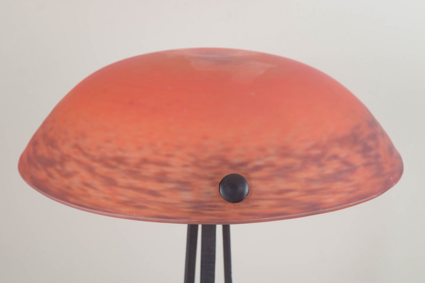 Dekorativ bordlampe i Art Nouveau-stil med støbejernsunderstel og håndlavet art glass-skærm i varme, rødlige nuancer. Den organiske formsprog og de slyngede jernranker skaber et elegant, skulpturelt udtryk.