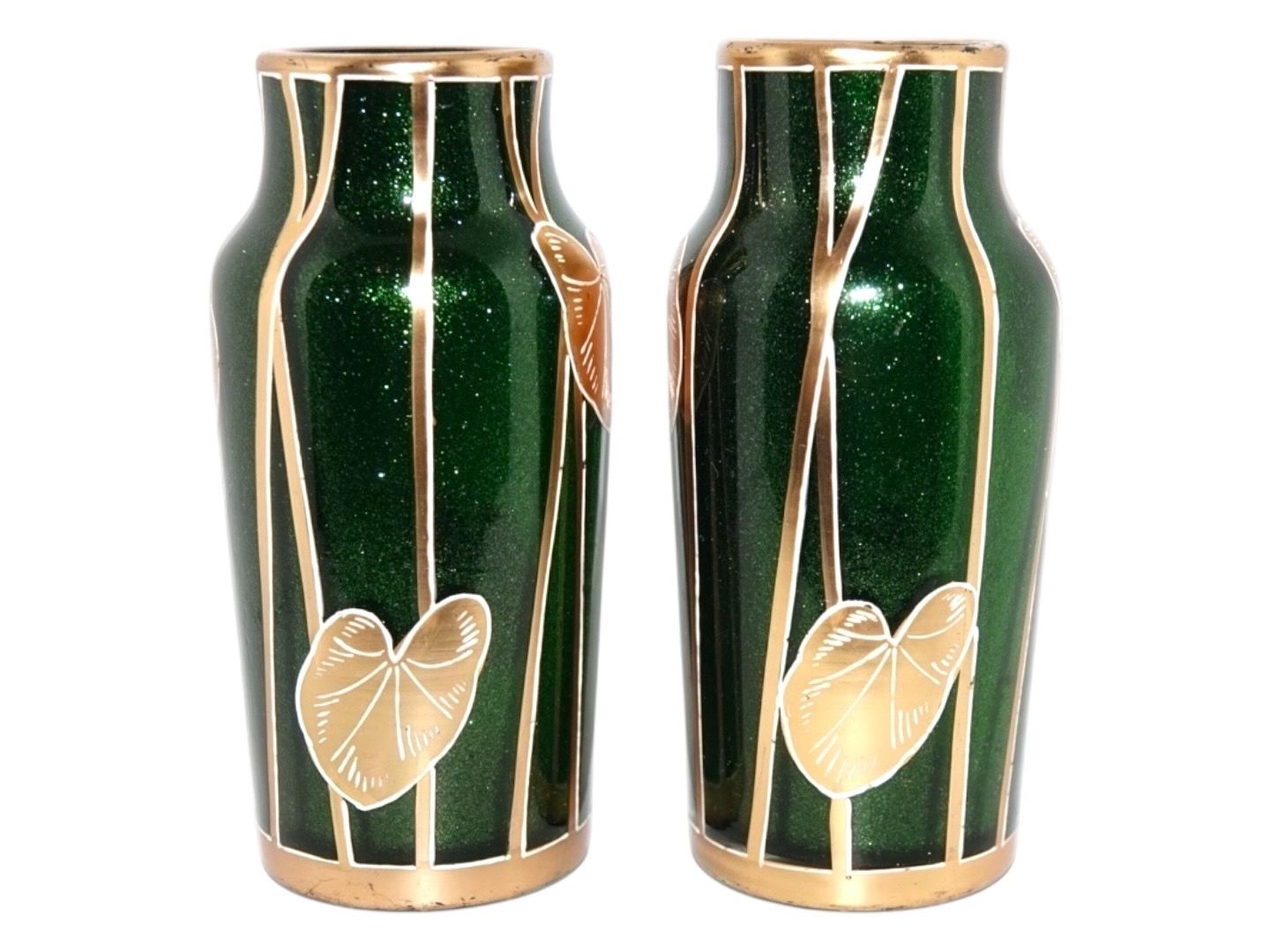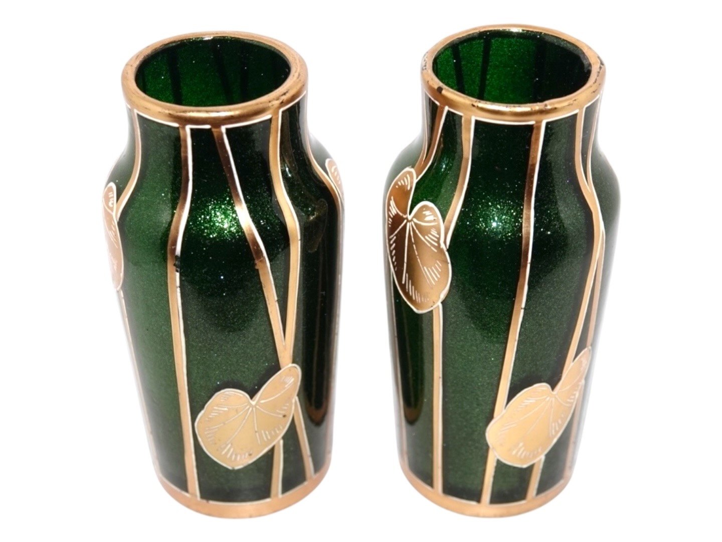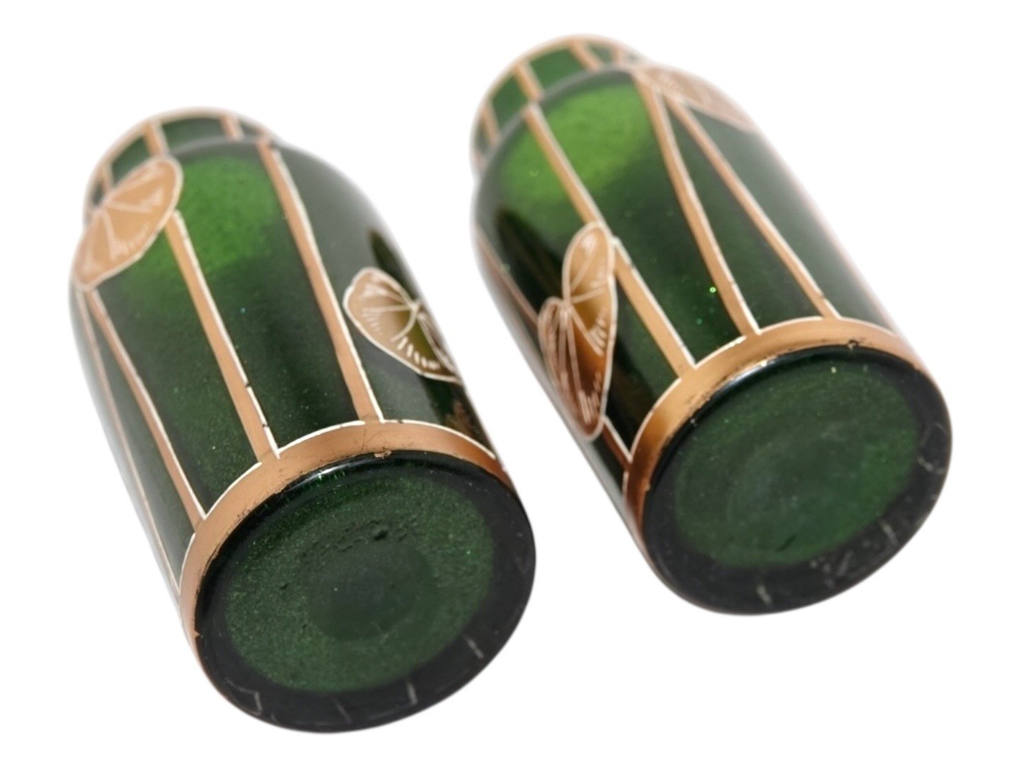 To grønne glas vaser med gulddekoration i jugendstil fra omkring 1900 til 1920.Højde 11,0 cm.