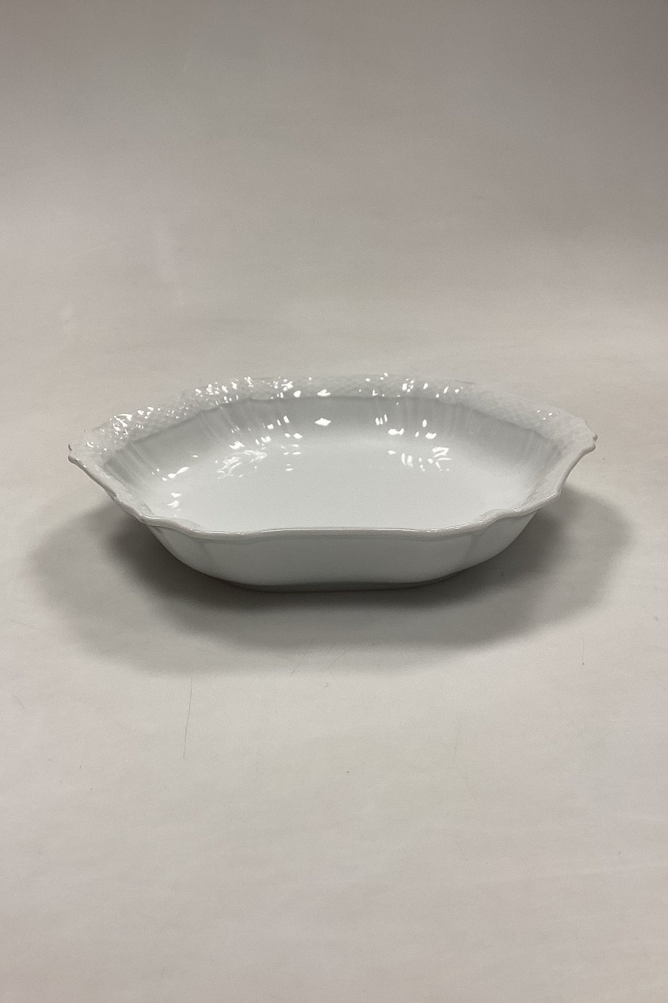 Royal Copenhagen Josephine White Curved Hexagonal Bowl No. 421. Measures 21 cm x 22.5 cm / 8.26 in. x 8.85 in. 2nd Quality with small glaze flaw on underside of rim.Stock: 1