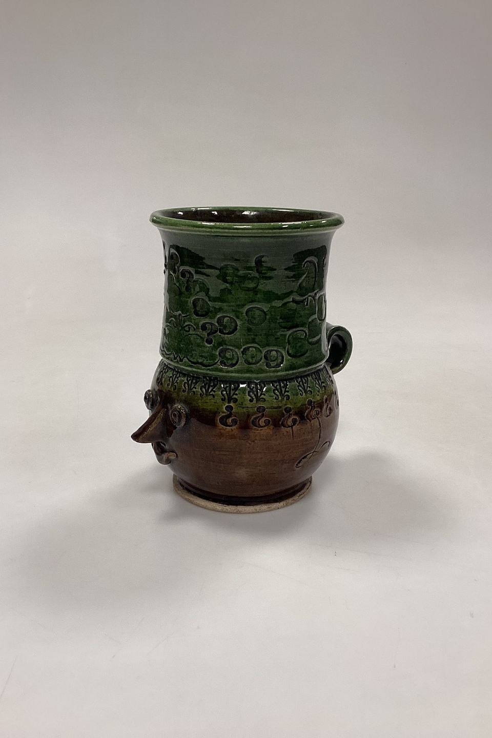 Bjørn Wiinblad Vase in glazed Stoneware. Motif with face, handle and embossed stencil patterns in brown and green glaze.Measures 14 cm / 5.51 in.